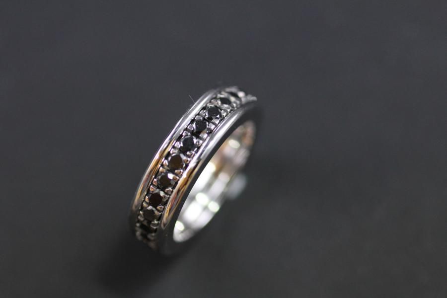 Dieser robust gearbeitete Alliance in Weissgold ist nicht nur durch die schwarzen Diamanten ausserhalb des gewohnten sondern auch durch die breiten Seitenabschlüsse.