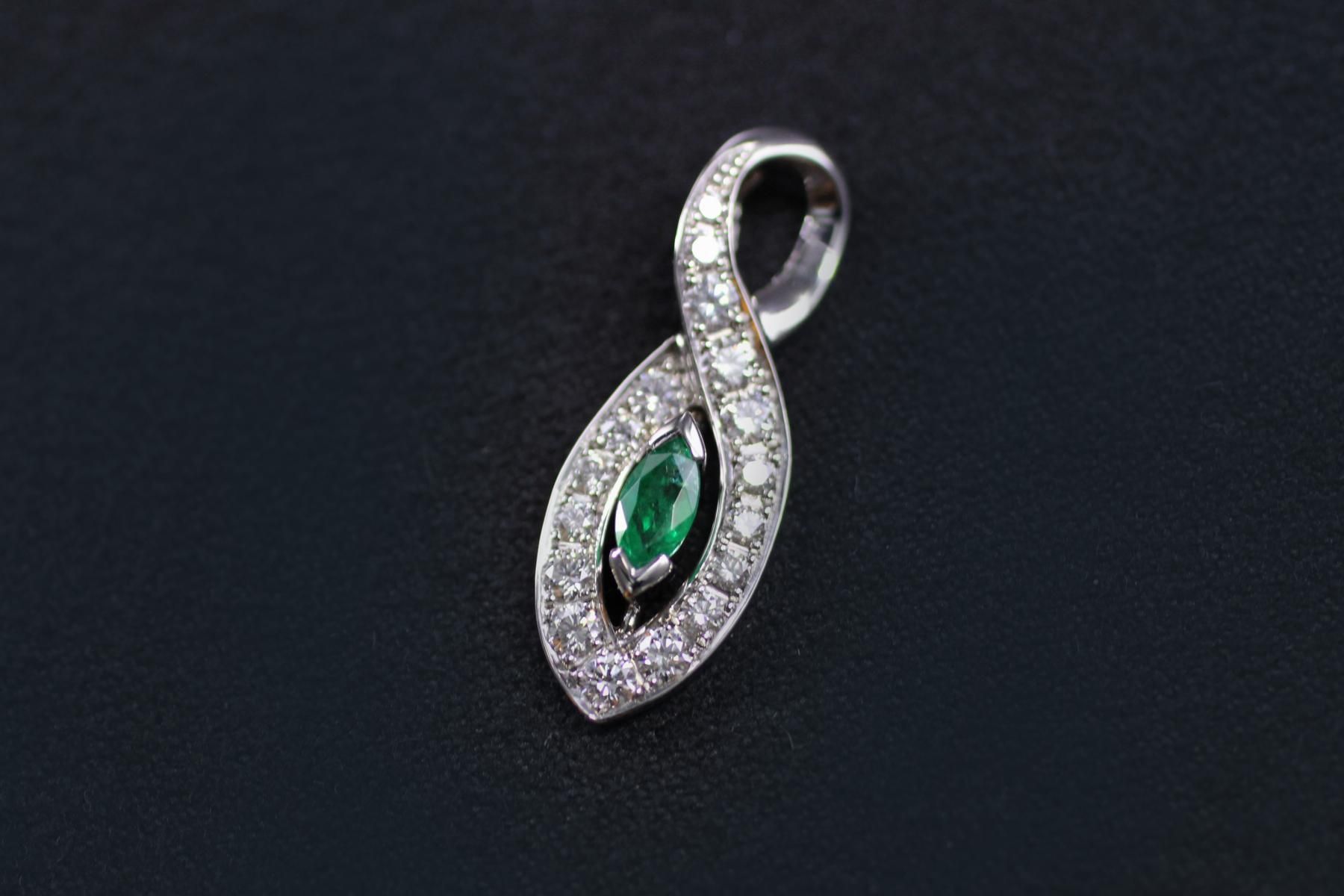Elegant geschwungener Anhänger mit Smaragd und Diamantpavé in Weissgold in Jugendstil Art.