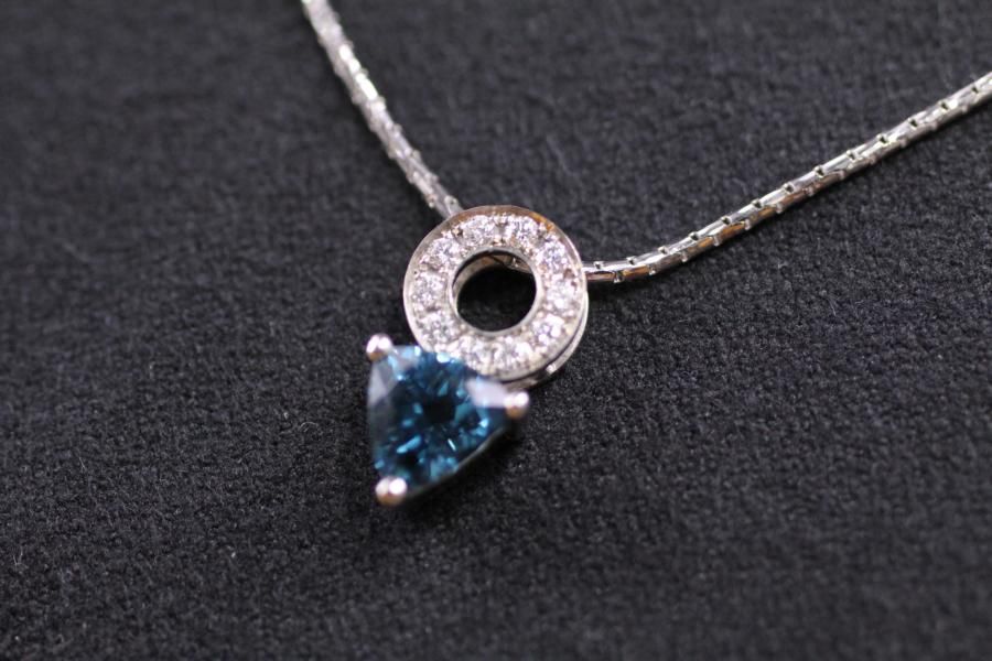 Anhänger aus Weissgold mit indigolit Turmalin triangelförmig geschliffen in einer 3 Grifffassung. Dazu ein Kreiseltement mit Diamanten ausgefasst. Der Hingucker an jedem Hals.