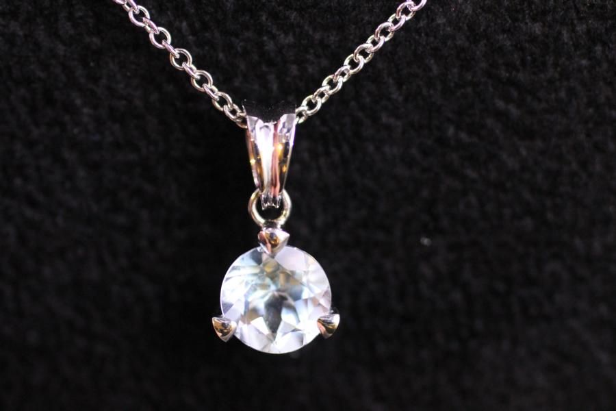 Klassischer Anhänger in Weissgold mit Aquamarine. Die Dreigrifffassung lässt den runden Stein schweben.