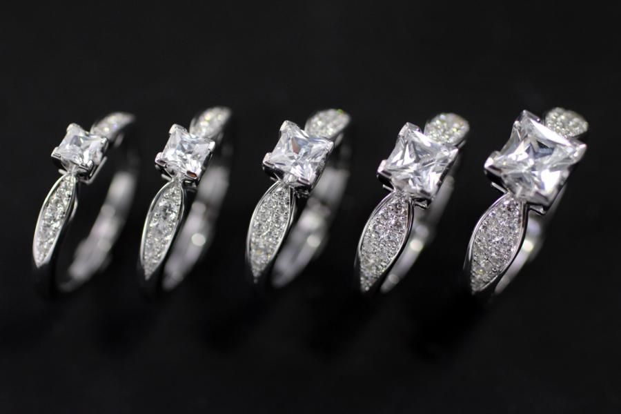 Dieser weissgoldene Antragsring gehört zu den verspieltesten unserer Modelle. Die tropfenförmig zulaufende Ringschiene hält die quadratische Krönchenfassung mit dem Princess sanft an der Spitze. Dieser extravagante Antragsring ist einer Prinzessin würdig. Dieser Ring bieten wir mit verschiedenen Steingrössen an: Das abgebildete Modell ist auf dem Gruppenbild in der Mitte und trägt einen 0,55ct. Diamant im princess schliff so wie 18 Brillanten mit 0,25ct. welche zusätzlich auf der Schiene funkeln. Fügen Sie die Ringe auf die Merkliste und wir werden ihnen eine Offerte zukommen lassen.