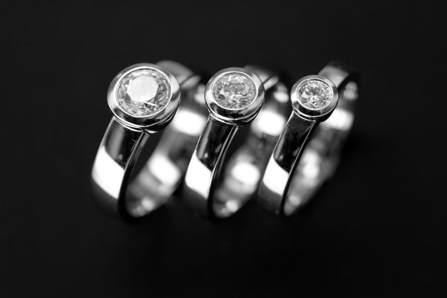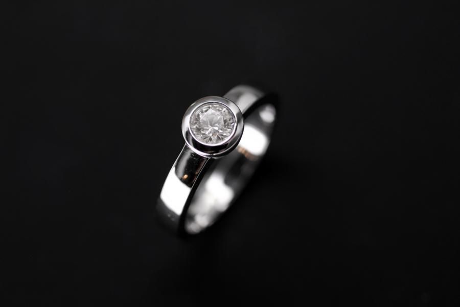 Dieser weissgoldene Verlobungsring ist schlicht und klassisch. Die Ringschiene ist oben leicht gewölbt, und parallel laufend. Der Brillant wird von einer robusten konischen Fassung gehalten. Dieser Ring bieten wir in verschiedenen Dimensionen an: Das abgebildete Modell ist auf dem Gruppenbild in der Mitte und trägt einen 0,5ct. Diamant im Brillantschliff. Wir offerieren ihnen aber auch gerne andere Materialien und Grössen. Fügen Sie die Ringe auf die Merkliste und wir werden ihnen eine Offerte zukommen lassen.