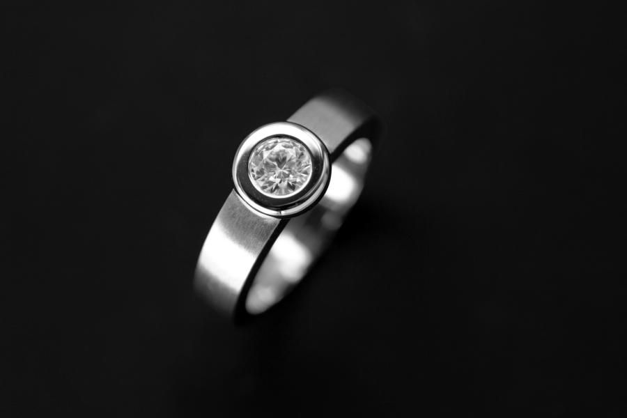 Dieser weissgoldene Verlobungsring ist schlicht und massiv. Die Ringschiene ist gerade, und leicht konisch. Der Brillant wird von einer schwebenden Fassung gehalten. Dieser Ring bieten wir in verschiedenen Dimensionen an: Das abgebildete Modell ist auf dem Gruppenbild in der Mitte und trägt einen 0,5ct. Diamant im Brillantschliff. Wir offerieren ihnen aber auch gerne andere Materialien und Grössen. Fügen Sie die Ringe auf die Merkliste und wir werden ihnen eine Offerte zukommen lassen.