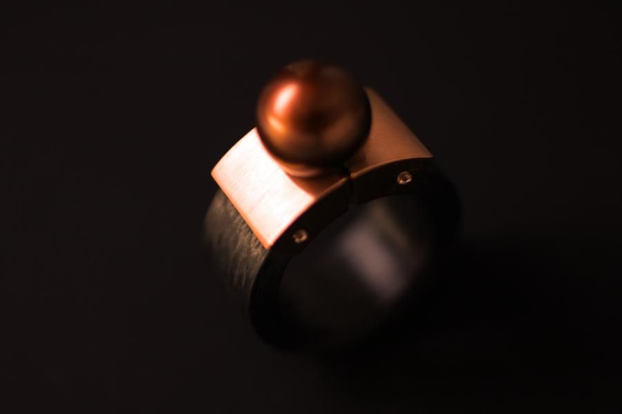 Carbon Ring und Rotgold Element mit einer "Chocolate" Tahiti Perle, miteinander verbunden durch unsere AXIS Technik.