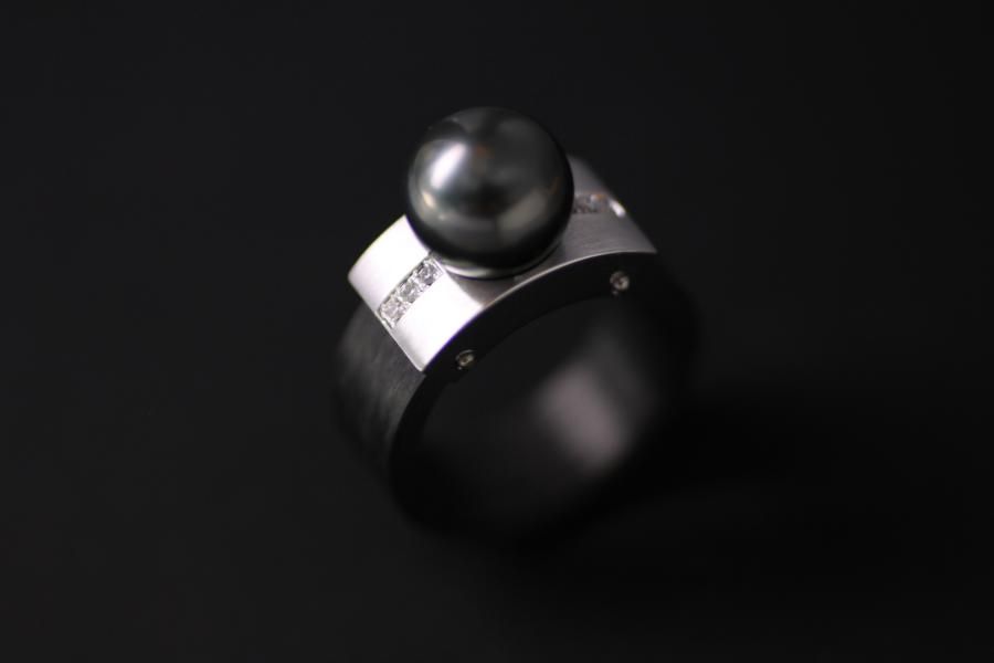 Carbon Ring und Weissgold Element mit Diamanten und einer Tahitiperle, miteinander verbunden durch unsere AXIS Technik.