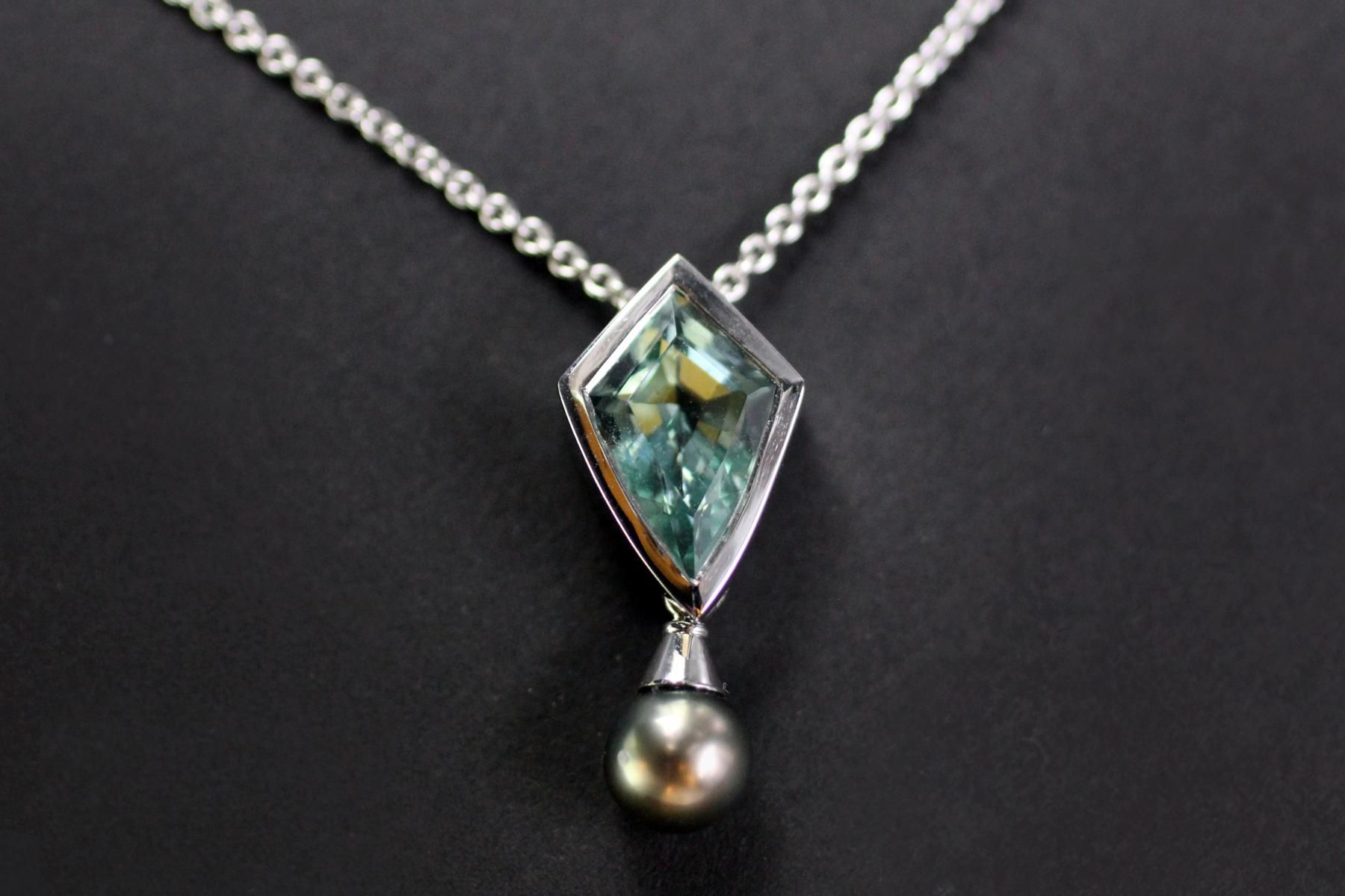 Dieses Kleinod aus Weissgold ziert ein wunderbarer seltener petrolfarbiger Turmalin in einem Drachenviereckigen schliff. Spielerisch hängt eine kleine Tahiti Perle an der Spitze. Ein Schmuckstück, das noch bei uns auf ihre Trägerin wartet.