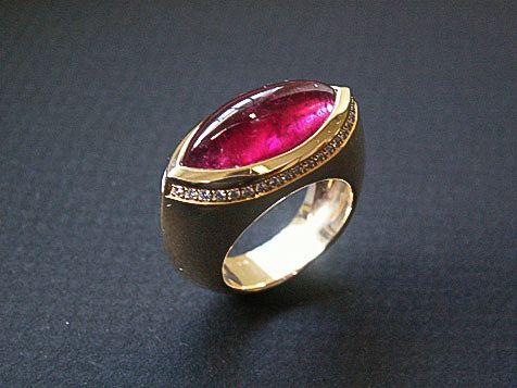 Damenring Navette Gelbgold mit rosa-Turamlin Cabochon, Brillanten