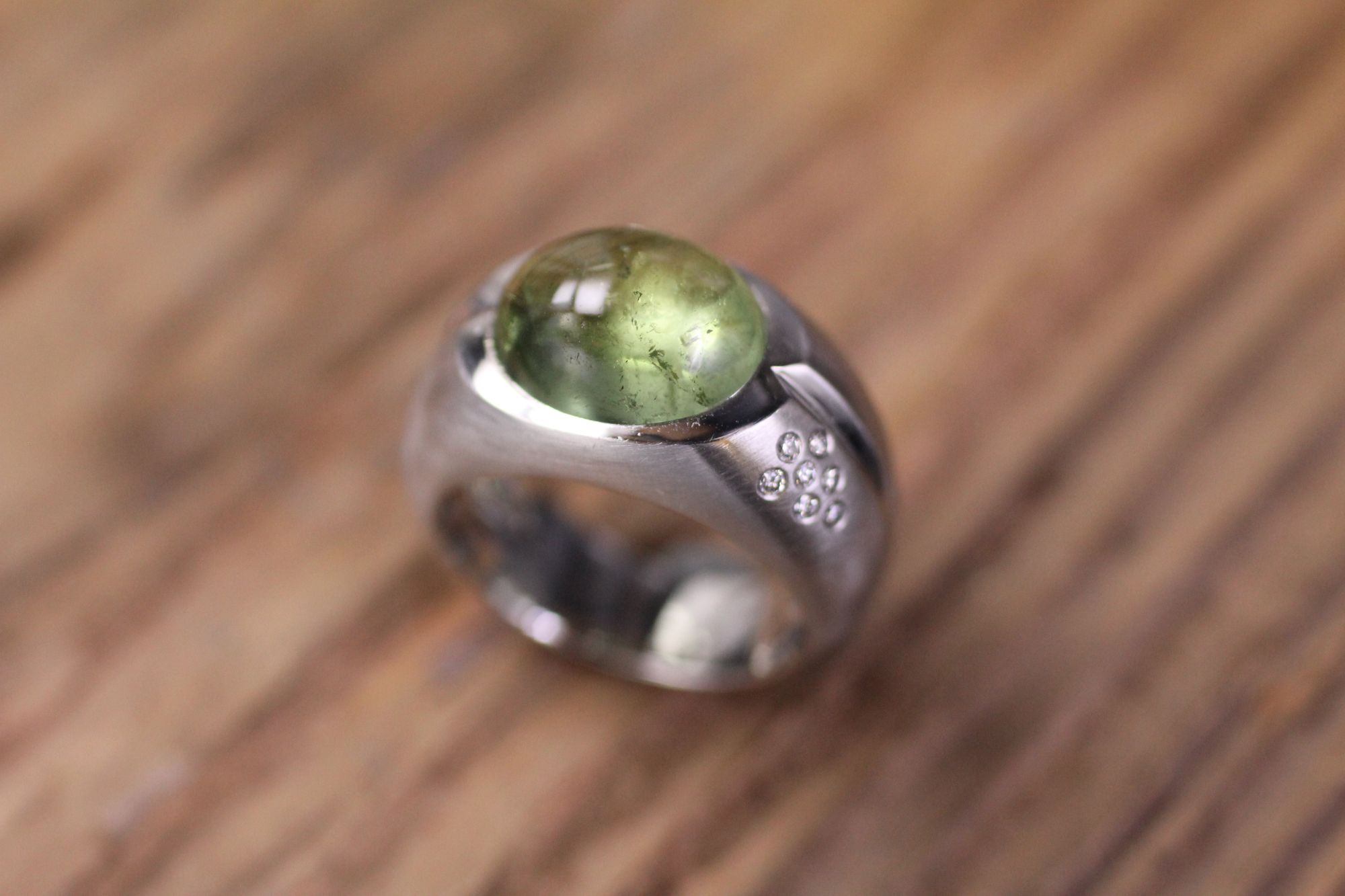 Weissgold Damenring mit hellgrünem Turmalin Cabochon und Brillanten.