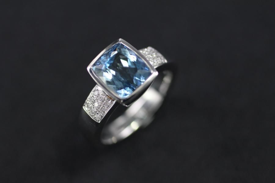 Aquamarin in funkelndem Kissenschliff mit Brillantpavé auf der Ringschiene. Zeitloses Design das zu allem passt.