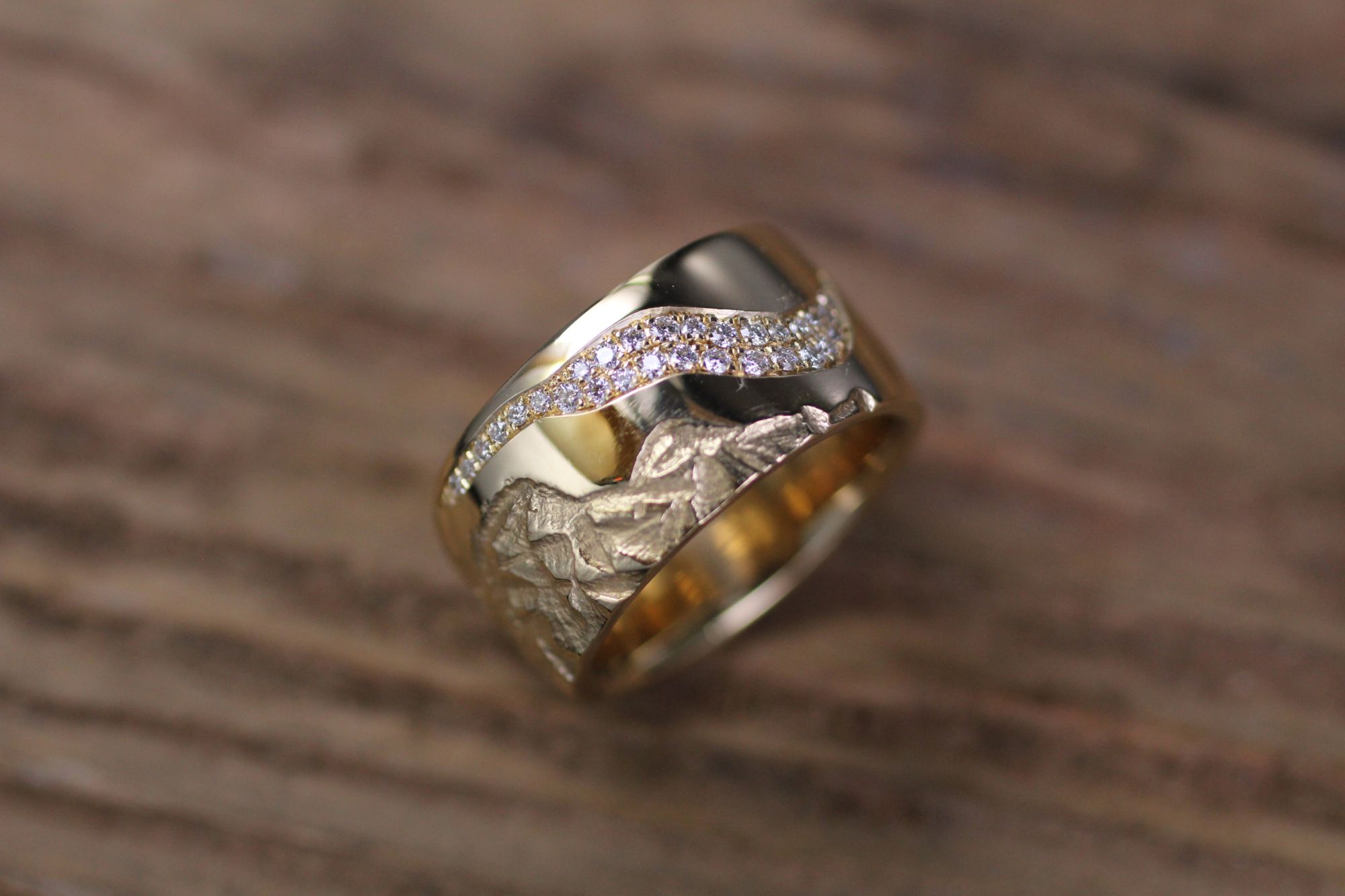 Gelbgold Damenring Struktur und glatt mit Brillanten. Kundenauftrag