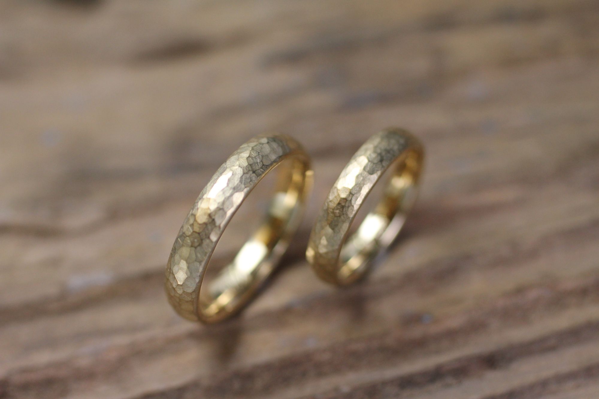 Eheringe in Gelbgold mit Hammer-Muster, ovale Form, feine Breite.