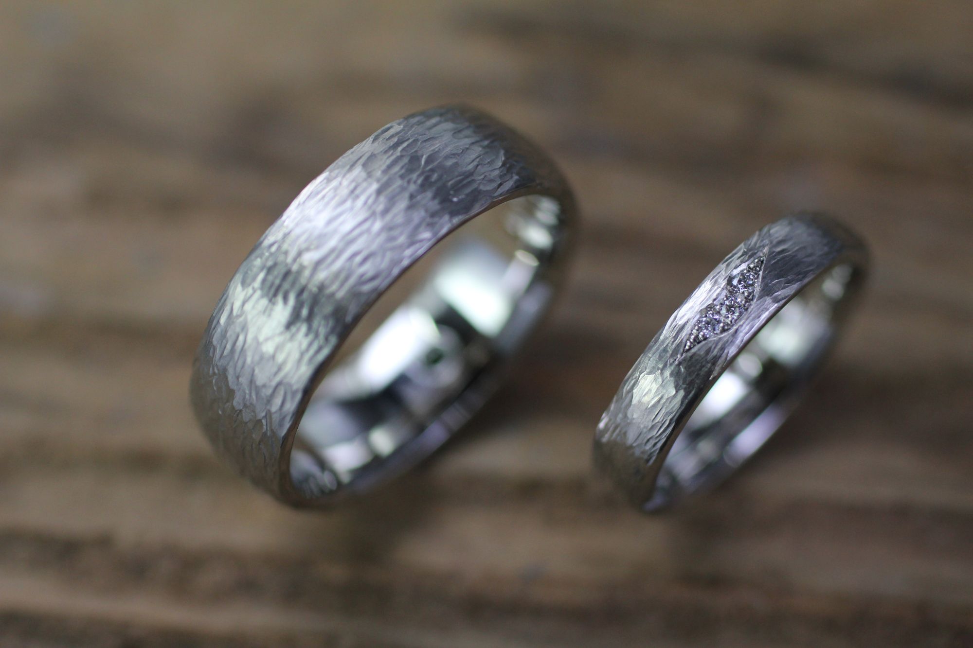 Hochzeitsringe Weissgold gehämmerte Wellen, Brillanten.