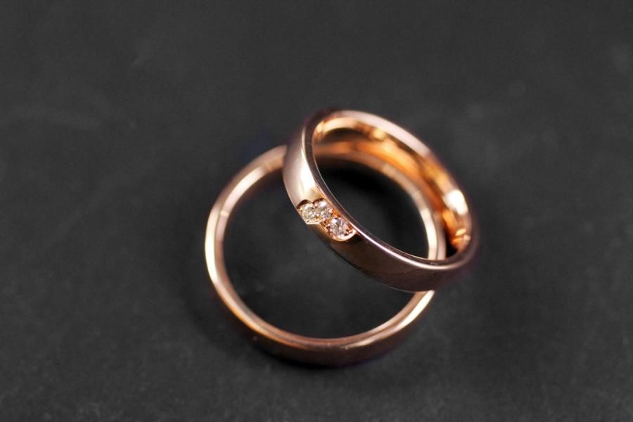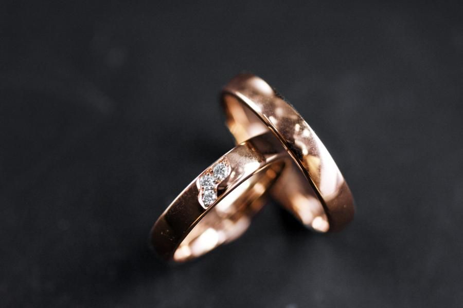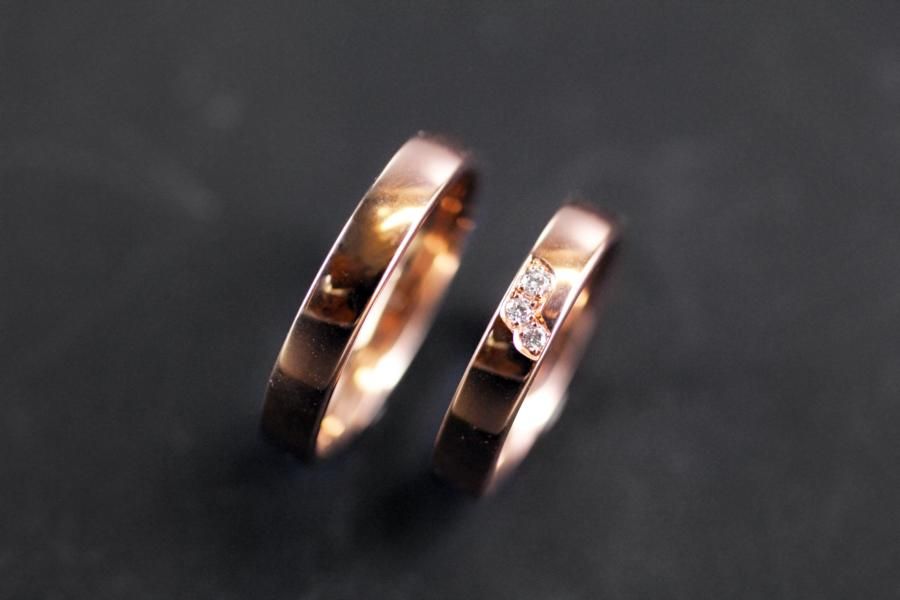 Leichte und schmale Eheringe aus Rotgold. Die Grundform ist auf allen Seiten leicht gewölbt ohne Ecken und Kanten. Dieses Modell ist von sehr hohem Tragekomfort. Der Damenring wird von drei verspielt gefassten Diamanten zusätzlich geschmückt.