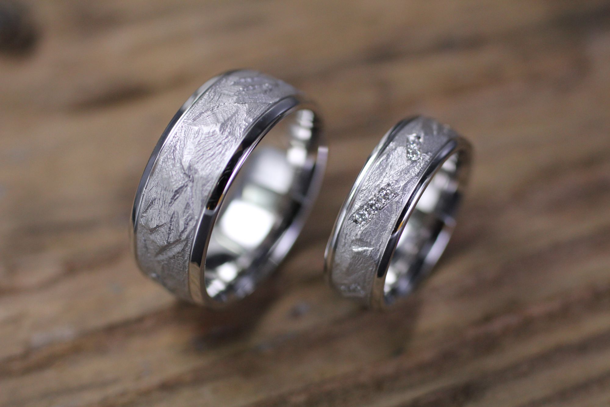 Trauringe Weissgold, Struktur und poliert glatt, Brillanten. Kundenauftrag