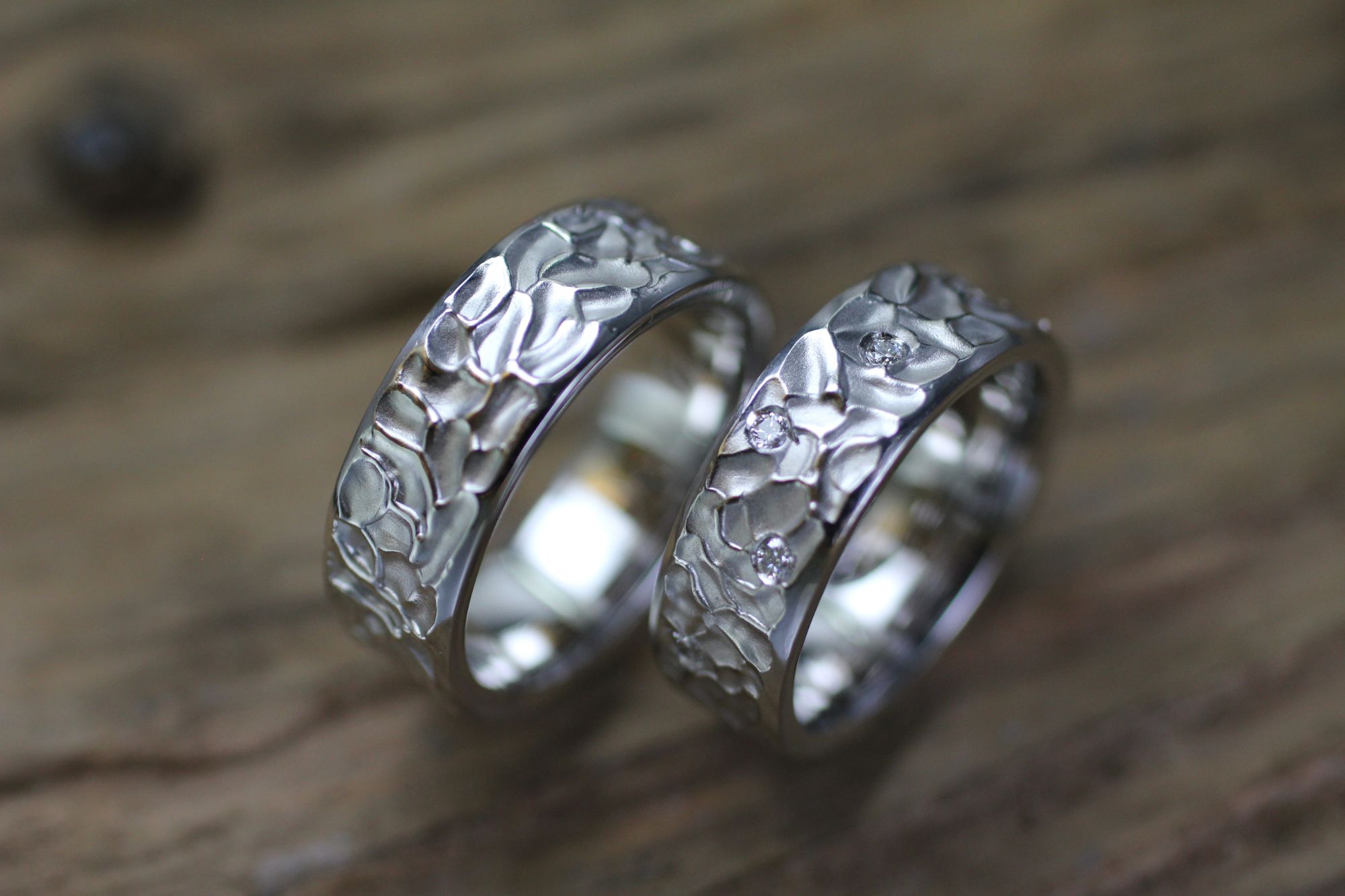 Trauringe in Weissgold, Wachsschmelz mit Brillanten.