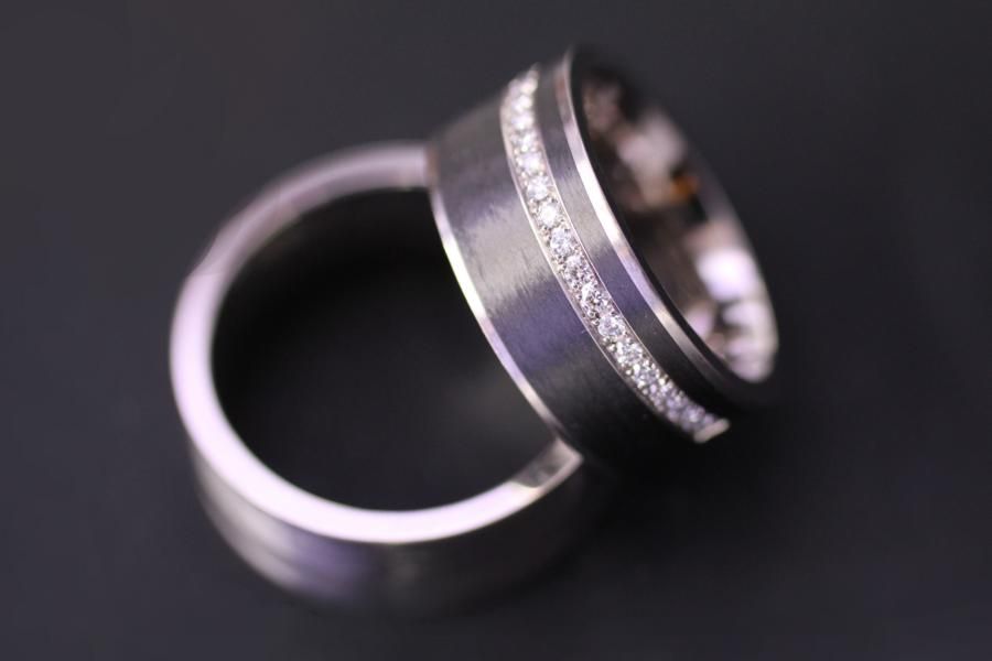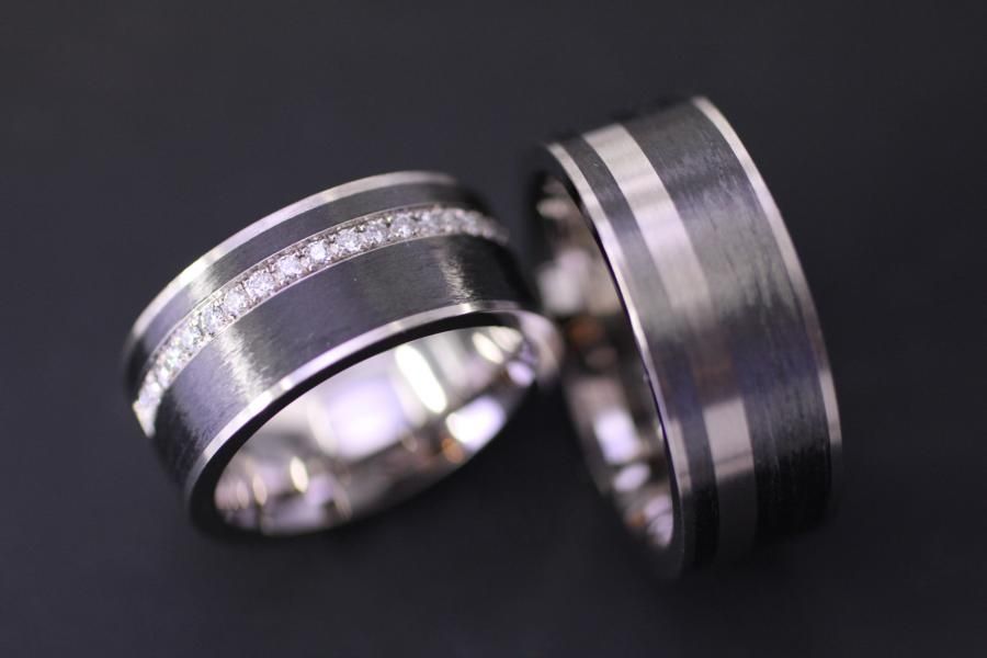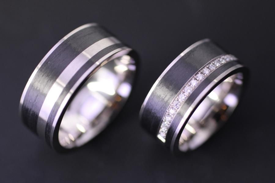 Eheringe mit flachem breitem Grundkörper, viel Carbon und etwas Weissgold. Das Carbon wurde auf den weissgoldenen Grundring gewickelt mit seitlichem Goldrand. Im Damenring ist ein glitzerndes Diamant Pavé eingearbeitet auf Wunsch auch rundherum. Carbon ist ein sehr robustes Material, bestens geeignet für Ringe die ein Leben lang halten müssen. Weitere Variationen dieser Eheringe sind nach Absprache möglich. Fügen Sie die Ringe auf die Merkliste und vergleichen Sie sie mit den anderen Schmuckstücken.