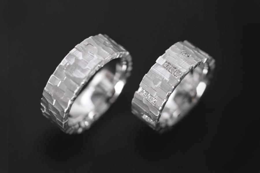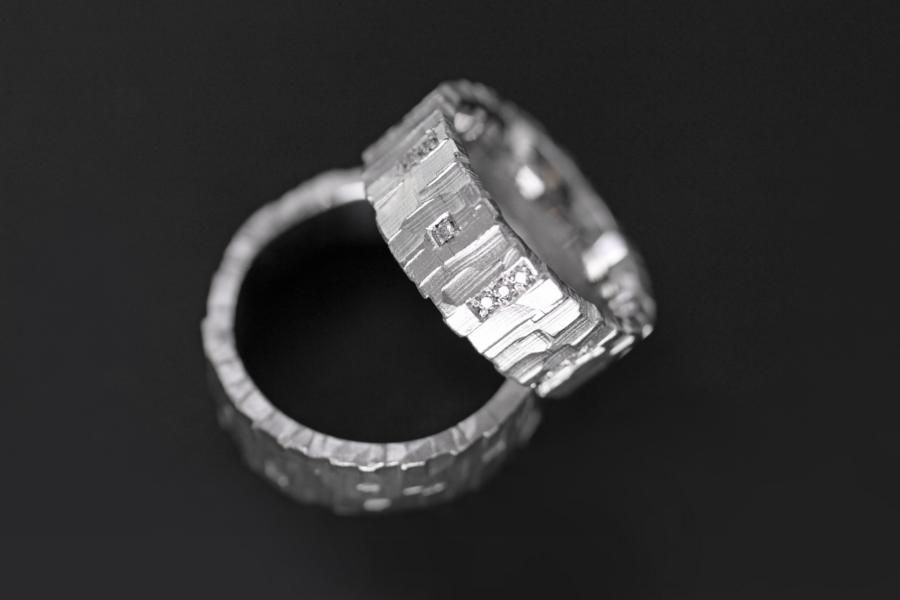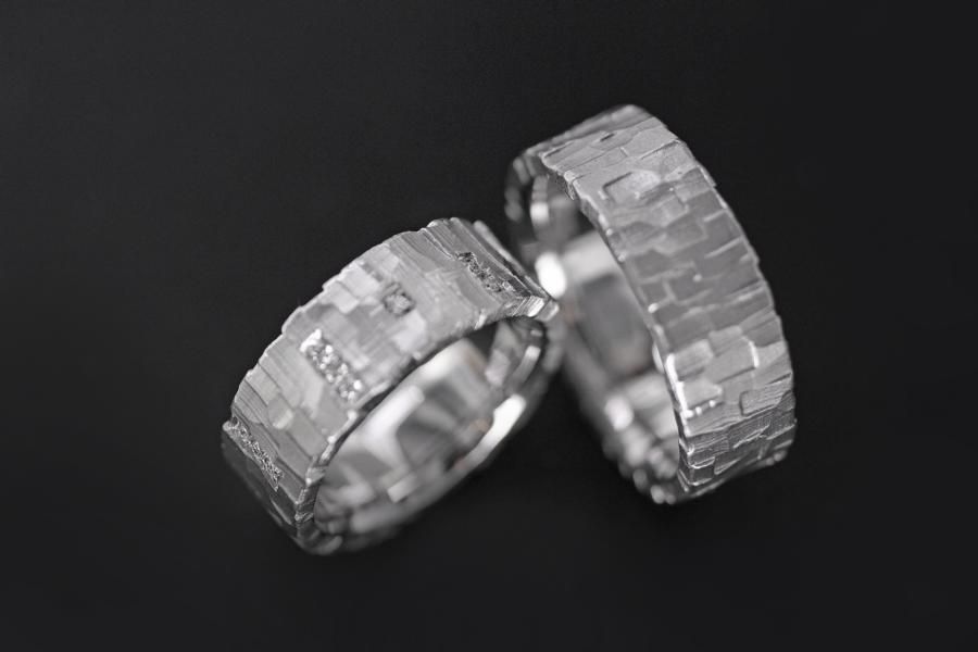 Unsere Eheringe "Quer Quadrat" sind aus Weissgold mit einem von Hand geschnitzten Muster, dass über die Seiten hinaus geht. Der Ringkörper ist Rechteckig und von einer angenehmen mittleren Breite. Der Damenring bezirzt zusätzlich durch 20 Diamanten die rundherum in verschieden grossen Pavés gefasst sind. Diese Ringe begeistern nicht nur Kubisten sondern auch Liebhaber des Individuellen und vielleicht erkennen sie mit etwas Phantasie noch viel mehr . Weitere Variationen dieser Trauringe sind nach Absprache möglich. Fügen Sie die Ringe auf die Merkliste und vergleichen Sie sie mit den anderen Schmuckstücken.