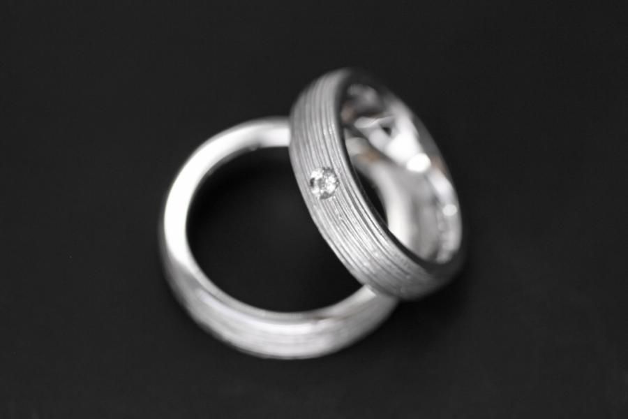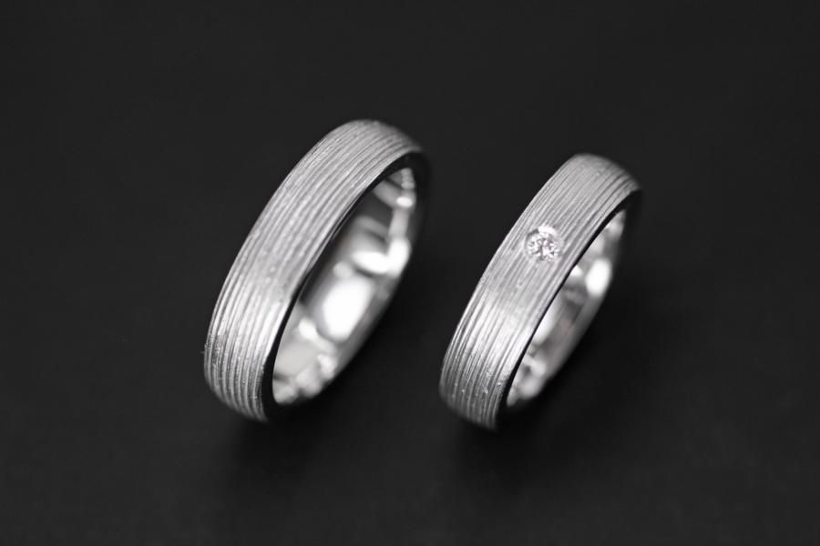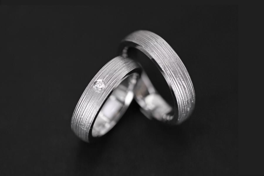 Elegante Eheringe in Weissgold. Die Rillen werden bei jedem Ring von Hand gedreht. Die Seiten sind flach, die Oberfläche ist bombiert. Diese Version ist von einer mittleren Breite, aber dennoch massiv und von einer zeitlosen Schönheit. Der Damenring wird bei unserem Beispiel zusätzlich mit einem Diamanten verziert. Weitere Variationen dieser Eheringe sind nach Absprache möglich. Fügen Sie die Ringe auf die Merkliste und vergleichen Sie sie mit den anderen Schmuckstücken.