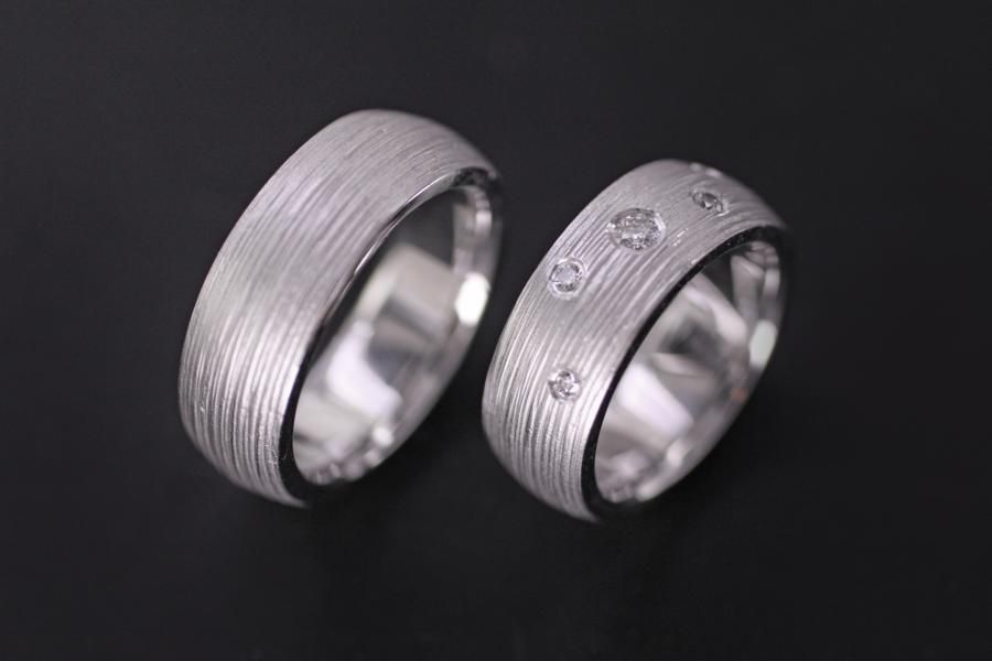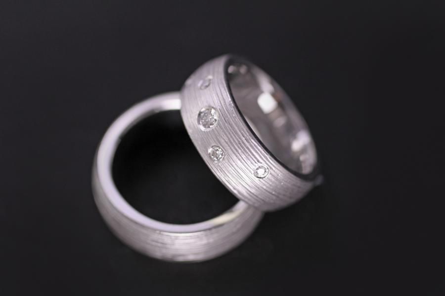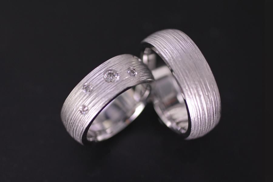 Unsere Eheringe mit dem handgemachtem Rillenmuster gehören bei uns schon fast zu den Klassikern. Sie wählen die Dicke und das Material. Eine breite Palette an Ansichtsmodellen vereinfacht ihnen die Vorstellung. Die Abgebildeten Ringe sind Breit, haben eine bombierte Oberfläche und sind Massiv genug um bis ans Lebensende ein verlässlicher Partner zu sein. Der Damenring wird zusätzlich mit 5 Brillanten verziert. Weitere Variationen dieser Eheringe sind nach Absprache möglich. Fügen Sie die Ringe auf die Merkliste und vergleichen Sie sie mit den anderen Schmuckstücken.