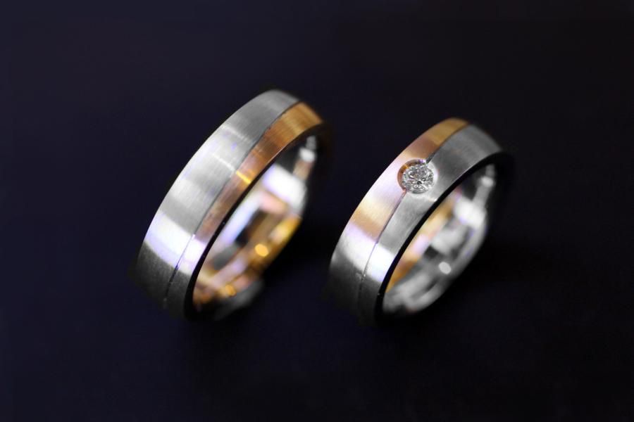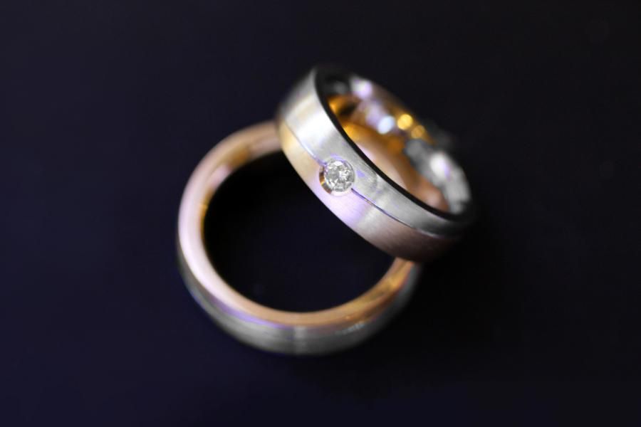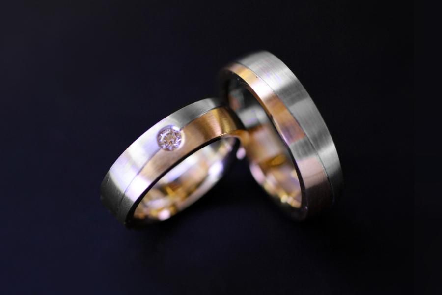Unsere Eheringe " Halb Halb" sind diagonal getrennt in Gelbgold und Weissgold. Ihr Grundkörper ist in einer mittleren Breite und oben leicht gewölbt.Die beiden Goldfarben sind mit einer feinen Trennlinie unterteilt und längs mattiert. Der Damenring wird zusätzlich mit einem Brillanten geziert. Diese bicoloren Klassiker machen nicht nur alles mit sie sind auch wandelbar wie das Leben selber. Weitere Variationen dieser Trauringe sind nach Absprache möglich. Fügen Sie die Ringe auf die Merkliste und vergleichen Sie sie mit den anderen Schmuckstücken