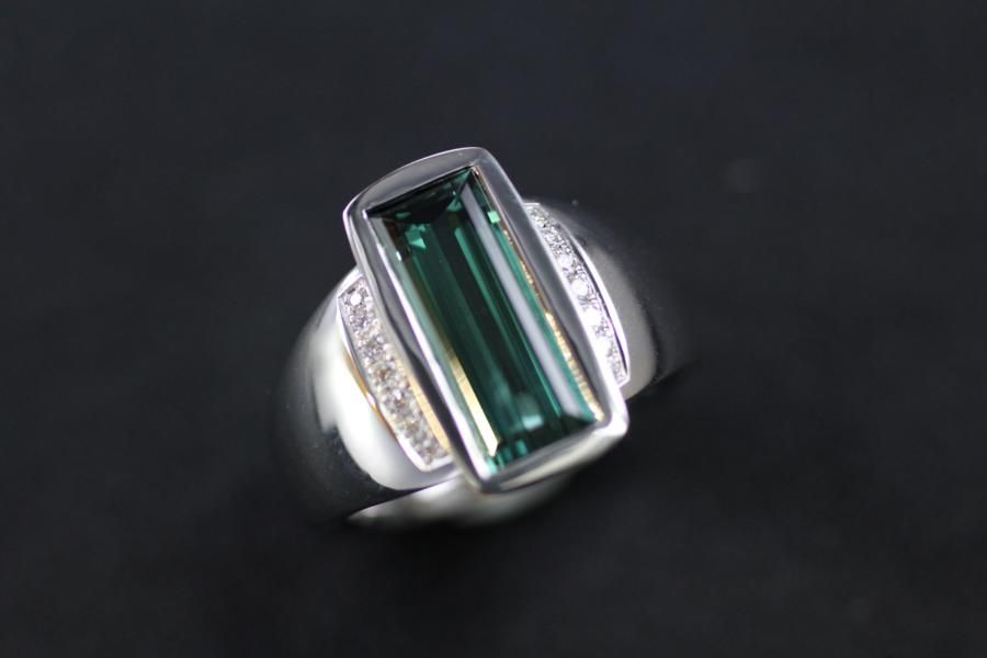 Allseitig gewölbter formvollendeter Ring mit elegantem rechteckigem Turmalin. Auf der Ringschiene sind auf beiden seiten Diamantpavés eingearbeitet. Zu diesem Ring haben wir das perfekt passende Paar Ohrhänger hergestellt.