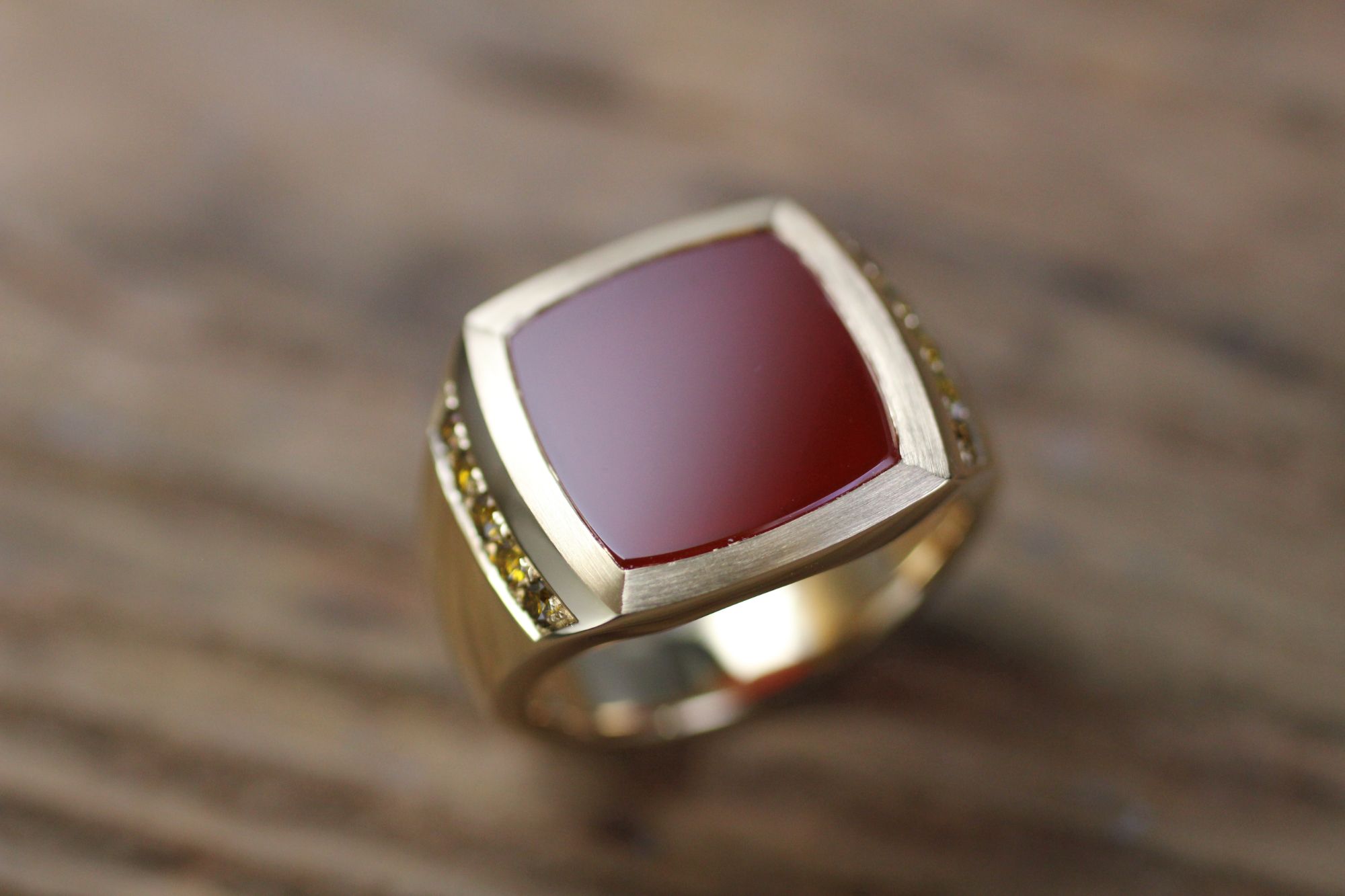 Herrenring Rotgold mit Carneol und Cognac-Brillanten. Kundenauftrag