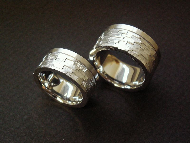 Hochzeitsringe Weissgold, geschnitzte Rechtecke / flach mit Brillanten