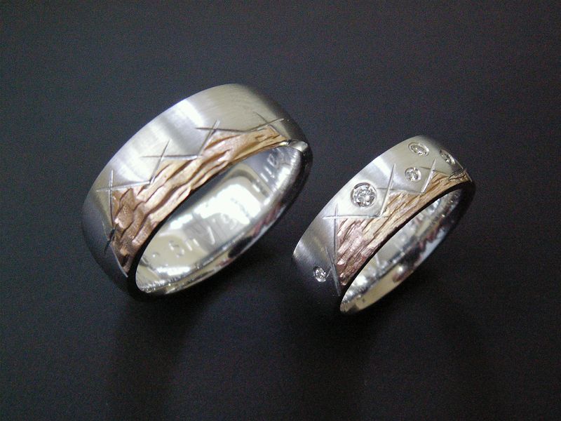 Hochzeitsringe Weissgold flach, Rotgold gefräst, Brillanten