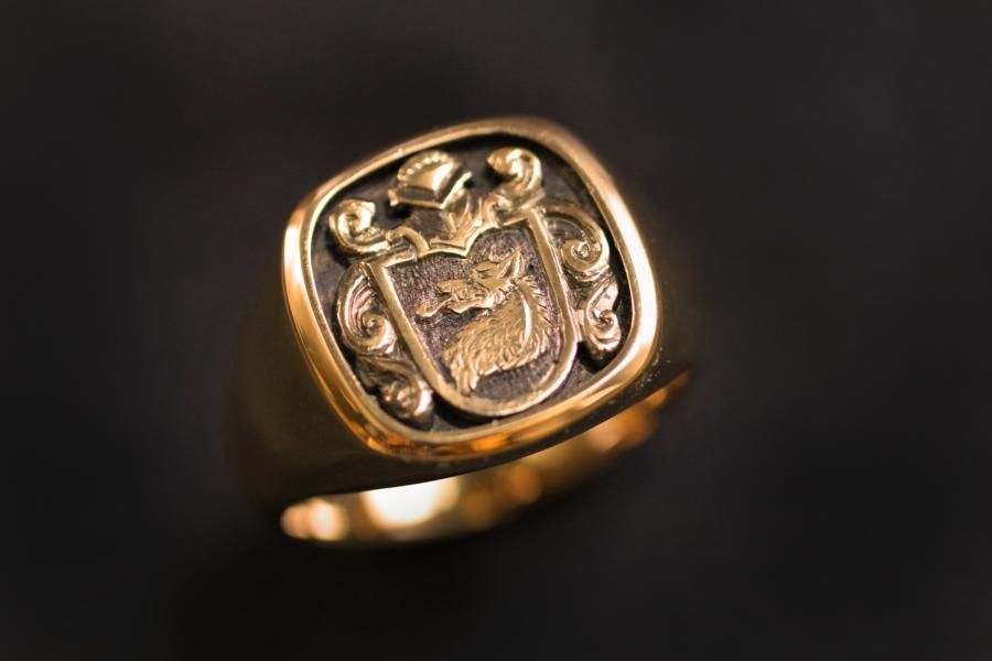 Herrenring mit graviertem Wappen, Helm und Zier. Auftrag nach Kundenwunsch und unserem Grundring.