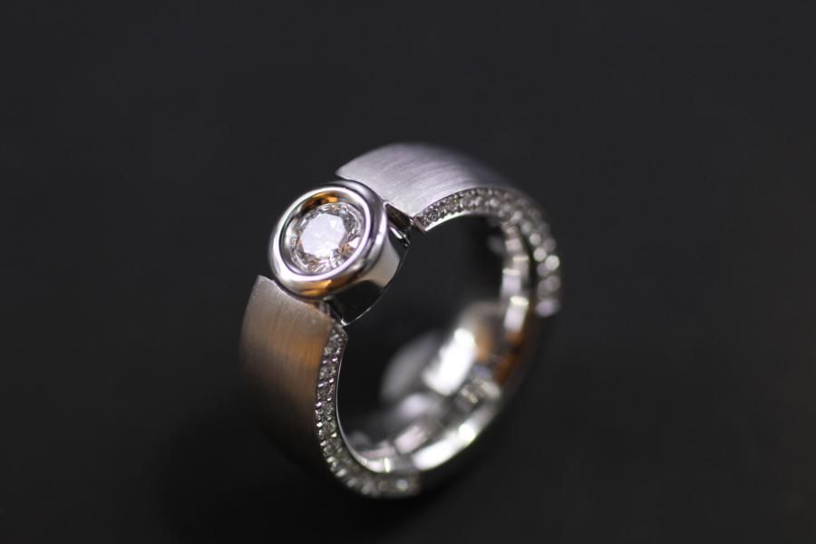 Massiver Solitäire mit zusätzlichem Brillant Pavé auf beiden Seiten. Dennoch bequem gearbeitet durch die gewölbte Fläche und die kaum überstehende Fassung.
