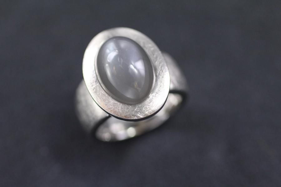 Damenring in Palladium mit indischem Mondstein. Die Oberfläche ist Eismattiert.