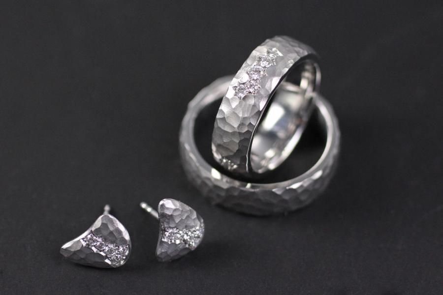 Unsere Ohrstecker aus Weissgold passen perfekt zu den Bienenwaben Trauringen aus unserem Sortiment. Ihre Oberfläche ist genau so gewölbt, mit einer feinen, seiden mattierten Struktur wie leicht gehämmert. Jeder Stecker glitzert zusätzlich mit einem Segment von Diamanten pavé gefasst. Gerne fertigen wir auch Ohrschmuck passend zu ihren Trauringen. Fügen Sie die Ringe auf die Merkliste oder verlangen sie ihre individuelle Offerte.