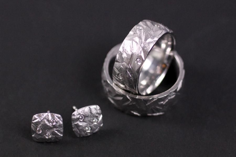 Unsere Ohrstecker aus Weissgold passen perfekt zu den Eispickel Trauringen aus unserem Sortiment. Ihre Oberfläche ist genau so gewölbt, mit einer tiefen, seiden mattierte Struktur. Jeder Stecker glitzert zusätzlich mit ein paar Diamanten. Gerne fertigen wir auch Ohrschmuck passend zu ihren Trauringen. Fügen Sie die Ringe auf die Merkliste oder verlangen sie ihre individuelle Offerte.
