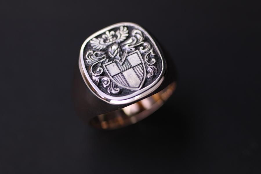Herrenring mit graviertem Wappen, Helm und Zier. Auftrag nach Kundenwunsch.