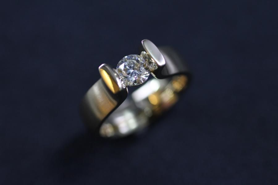 Raffinierter gelbgold Solitäire bei dem die oben offene massive Ringschiene sich zur Seite schwingt und darin der Diamant eingeklemmt ist.