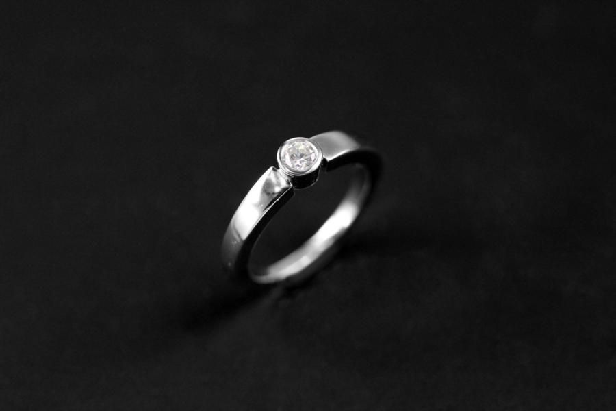 Solitär mit konischer leicht gewölbter Schiene und geschlossener Fassung. Varianten in Weissgold sowie in Gelbgold.