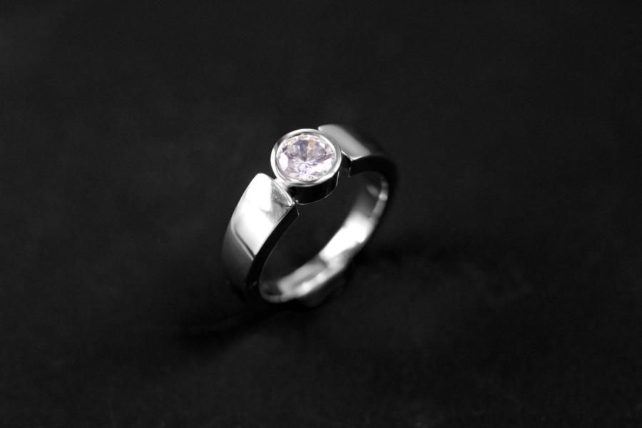 Solitär mit konischer leicht gewölbter Schiene und geschlossener Fassung. Varianten in Weissgold sowie in Gelbgold.
