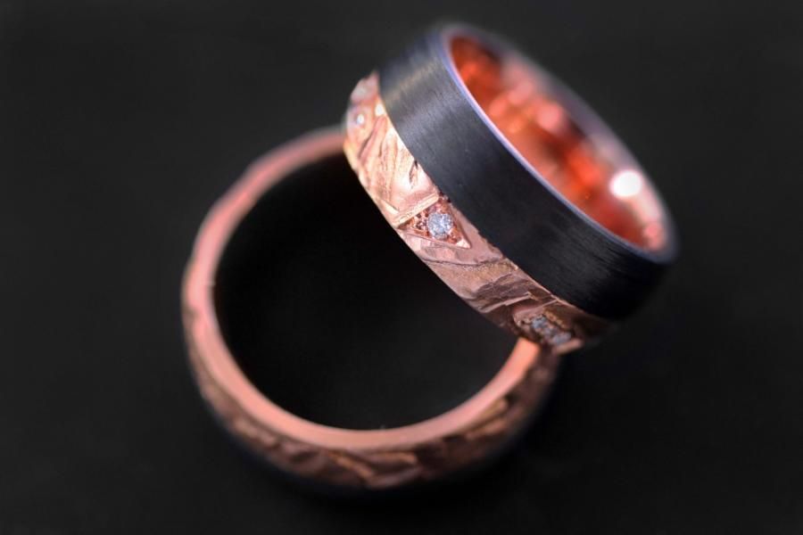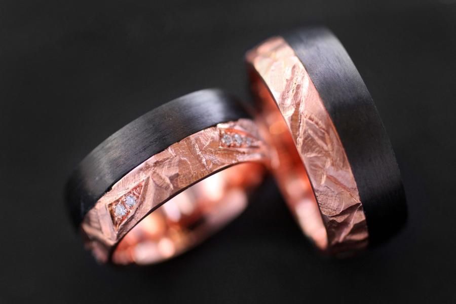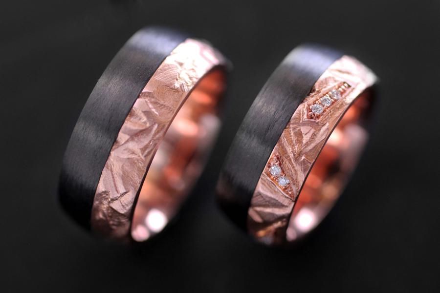 Trauringe handgefertigt aus der einzigartigen Rotgold 6N Legierung. Harmoniert ausgezeichnet mit rosa Hautton. Das Carbon nimmt bei unserem Beispiel 2/3 der Oberfläche ein. Die Struktur wirkt wie gebrochenes Eis. Im Damenring sind 14 Brillanten in Zweier und Dreiergruppen trapezförmig in Pavé gefasst. Diese einzigartigen Trauringe werden vielen Wünschen gerecht: Sie sind schmückend, aber doch diskret, massiv und bequem. Überzeugen sie sich selber. Für Paare die das ausgefallene lieben. Weitere Variationen dieser Trauringe sind nach Absprache möglich. Fügen Sie die Ringe auf die Merkliste und vergleichen Sie sie mit den anderen Schmuckstücken.