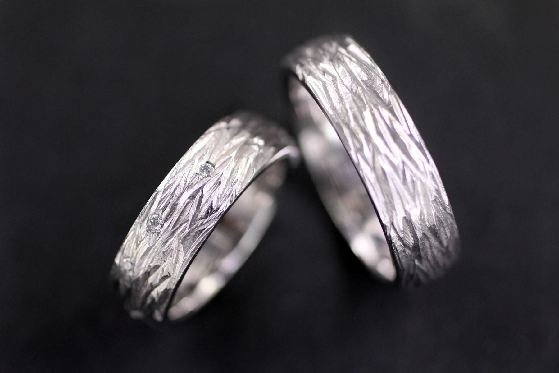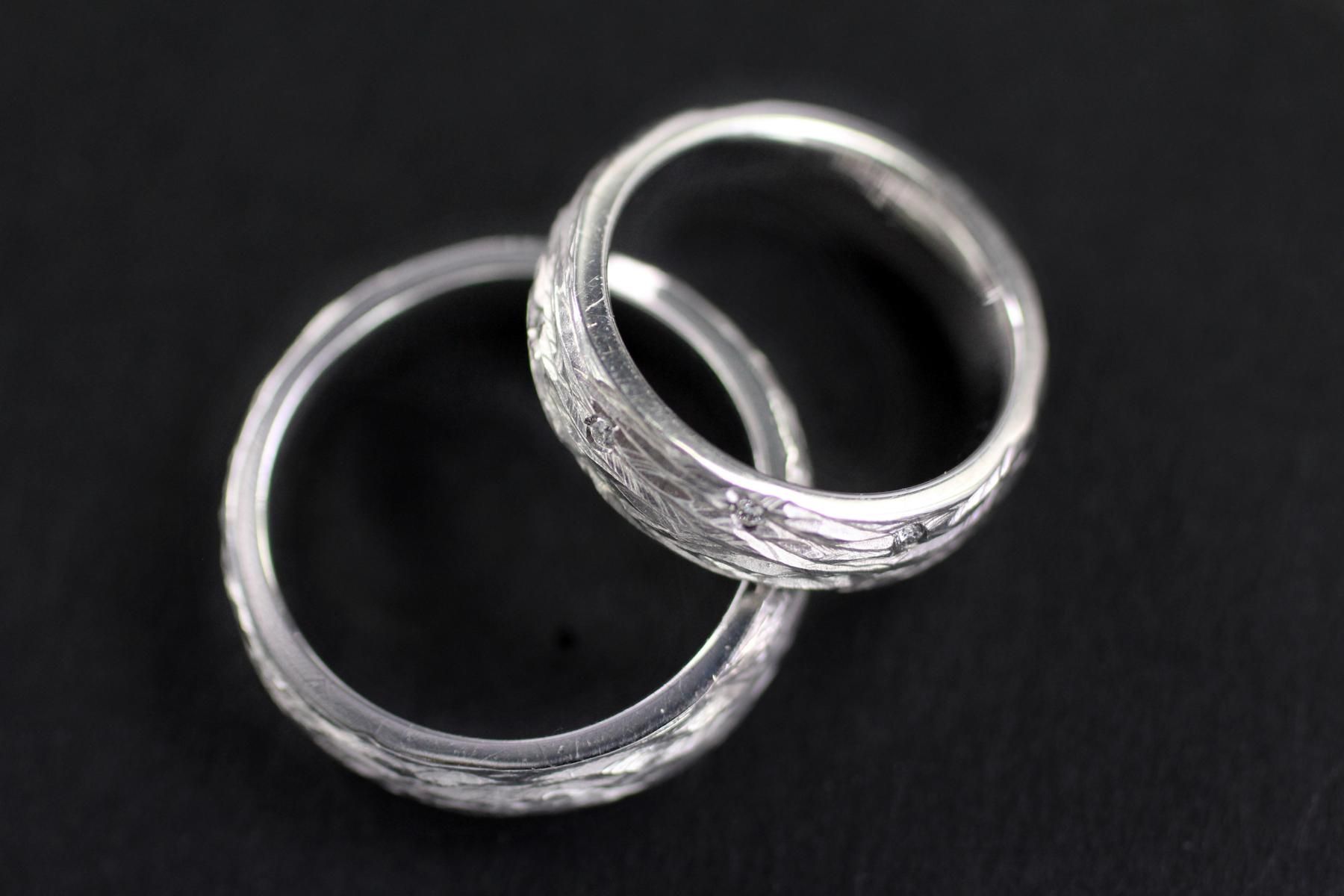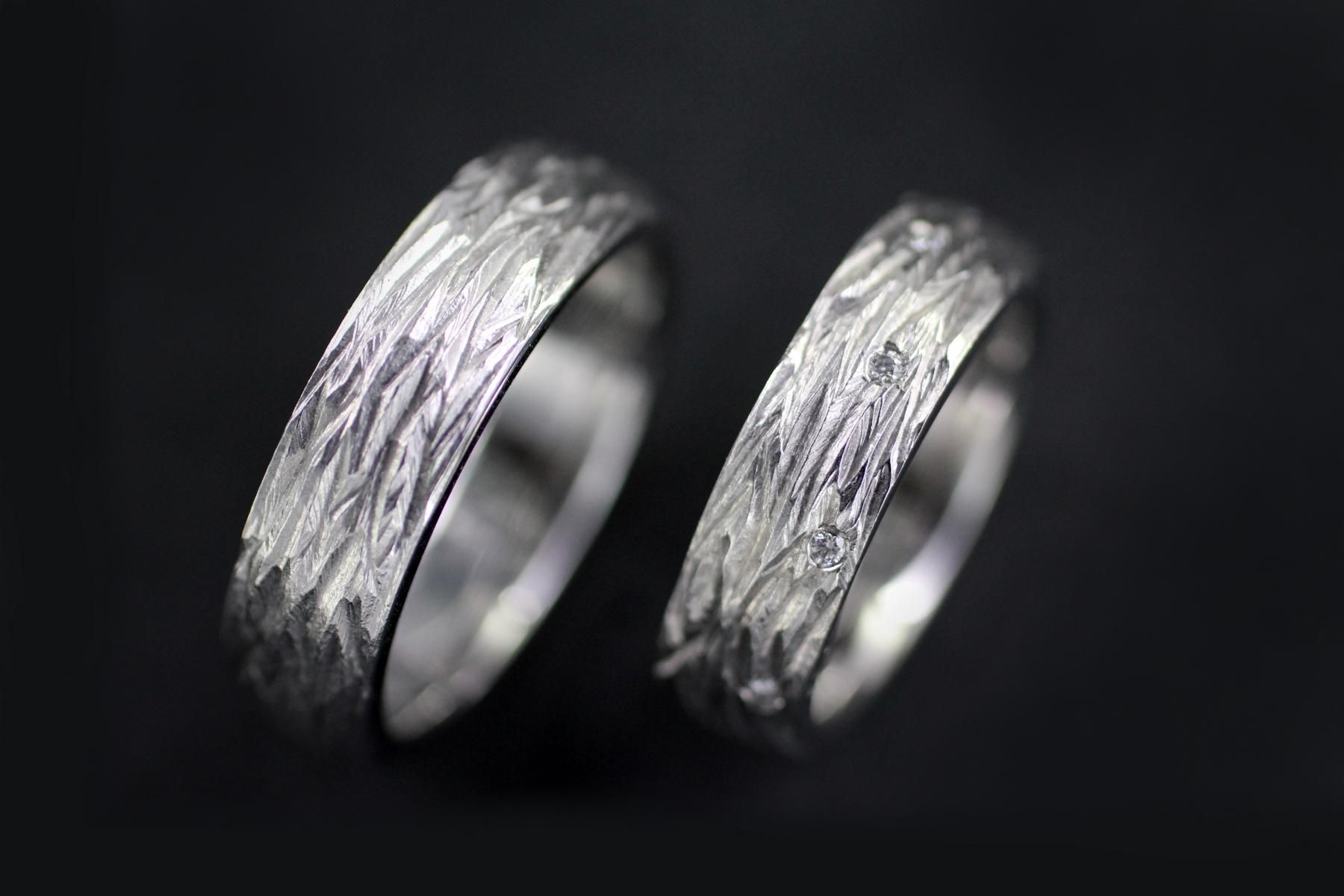 Die Trauringe «Gesteinsschichten» haben wir mit Weissgold geschmiedet. Die Eheringe haben eine moderne, leicht gewölbte Ringform. Sie sind seiden glänzend und tief strukturiert. Im Damenring sind rundherum 11 Brillanten in Wellenlinie eingefasst. Weitere Variationen dieser Trauringe sind nach Absprache möglich. Fügen Sie die Ringe auf die Merkliste und vergleichen Sie sie mit den anderen Schmuckstücken.
