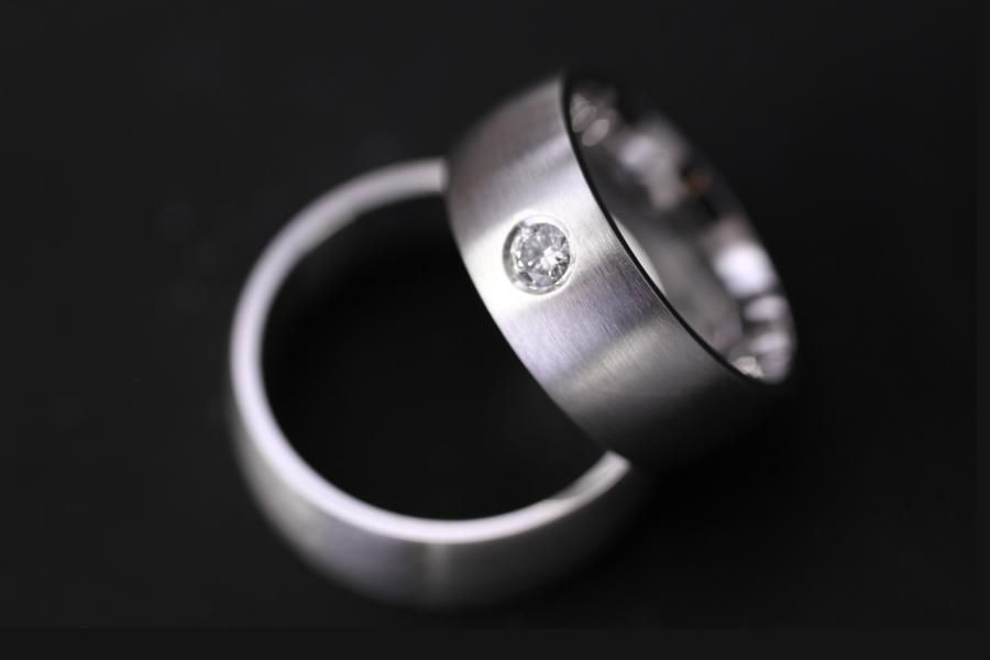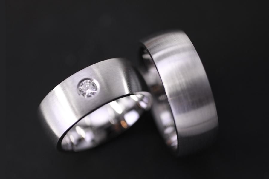 Klassische Trauringe aus Weissgold. Gewölbter Grundkörper von einer angenehmen breite. Oben längsmatt oder eismatt, oder nach ihren Wünschen gestalltet. Der Damenring ist bei unserem Modell zusätzlich mit einem Diamanten geschmückt. Weitere Variationen dieser Trauringe sind nach Absprache möglich. Fügen Sie die Ringe auf die Merkliste und vergleichen Sie sie mit den anderen Schmuckstücken.