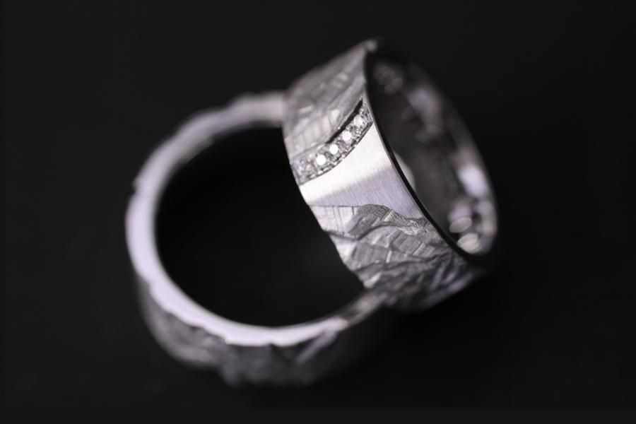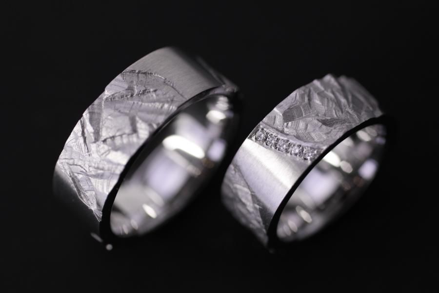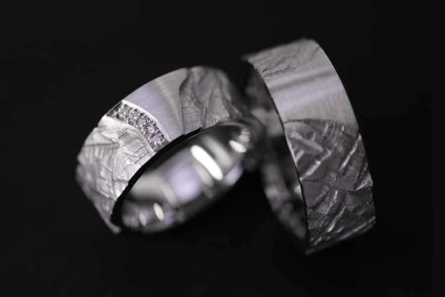Diese Trauringe sind ein perfekter Kompromiss zwischen glatter und strukturierter Oberfläche. Die Struktur ist tief geschnitzt und mattiert. Die Abgebildete Version der Ringe ist breit und massiv mit einem flachen Ringkörper. Der Übergang von strukturierter Oberfläche zur glatten ist beim Damenring von einem Diamantpavé gesäumt. Weitere Variationen dieser Trauringe sind nach Absprache möglich. Fügen Sie die Ringe auf die Merkliste und vergleichen Sie sie mit den anderen Schmuckstücken.