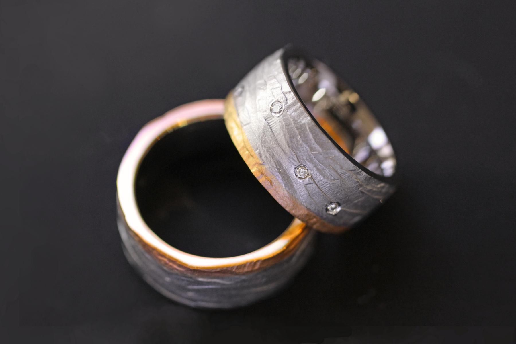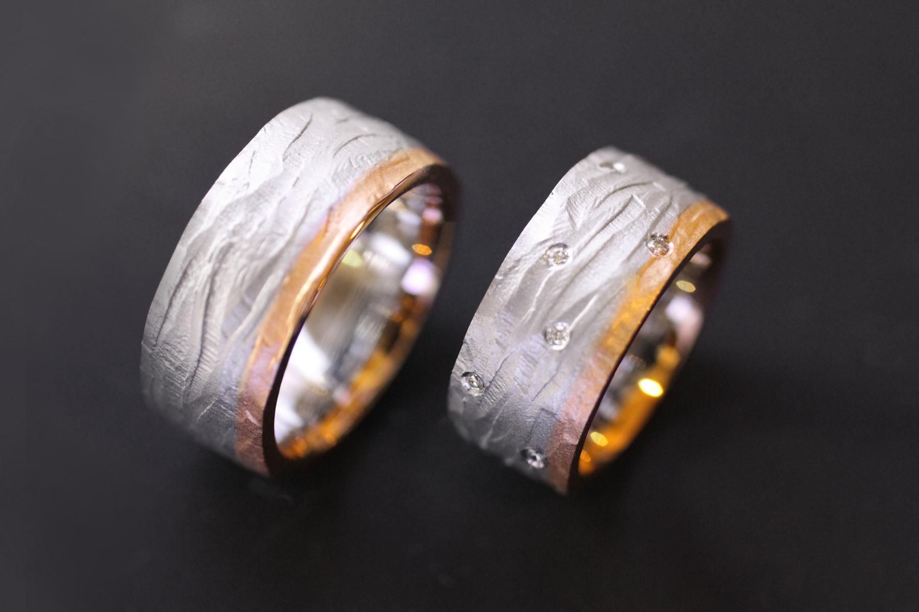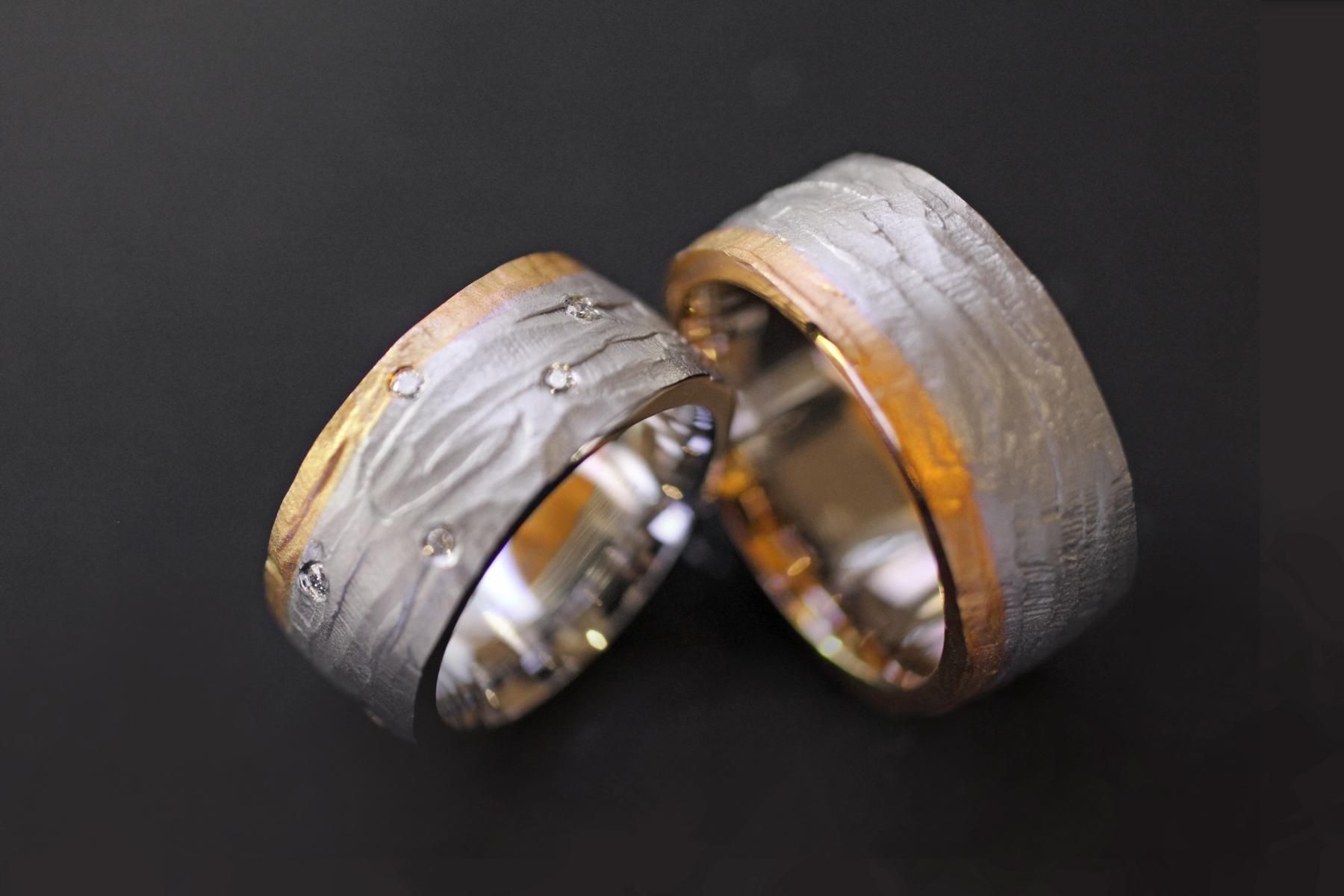 Diese Trauringe wurden (wie fast alle unsere Ringe) individuell von Hand für sie geschnitzt. Diese Weiss und Gelbgold Version hat eine gerade längs geschnitzte Oberfläche mit geraden glänzenden Seiten. Die Ringe sind Breite und Massiv und gehören zu den Ringen die durch das Tragen an Charm nicht verlieren. Im Damenring sind rundherum 12 Diamanten eingearbeitet von denen immer ein paar oben sind und funkeln. Weitere Variationen dieser Trauringe sind nach Absprache möglich. Fügen Sie die Ringe auf die Merkliste und vergleichen Sie sie mit den anderen Schmuckstücken.