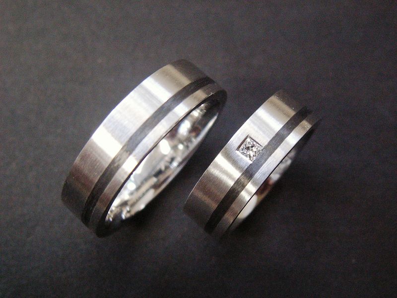 Trauringe Weissgold flach mit Carbon und Princess-Diamanten