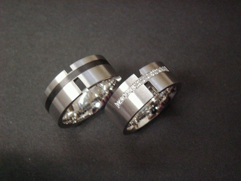 Trauringe flach Brücke mit Carbon oder Brillant-pavé