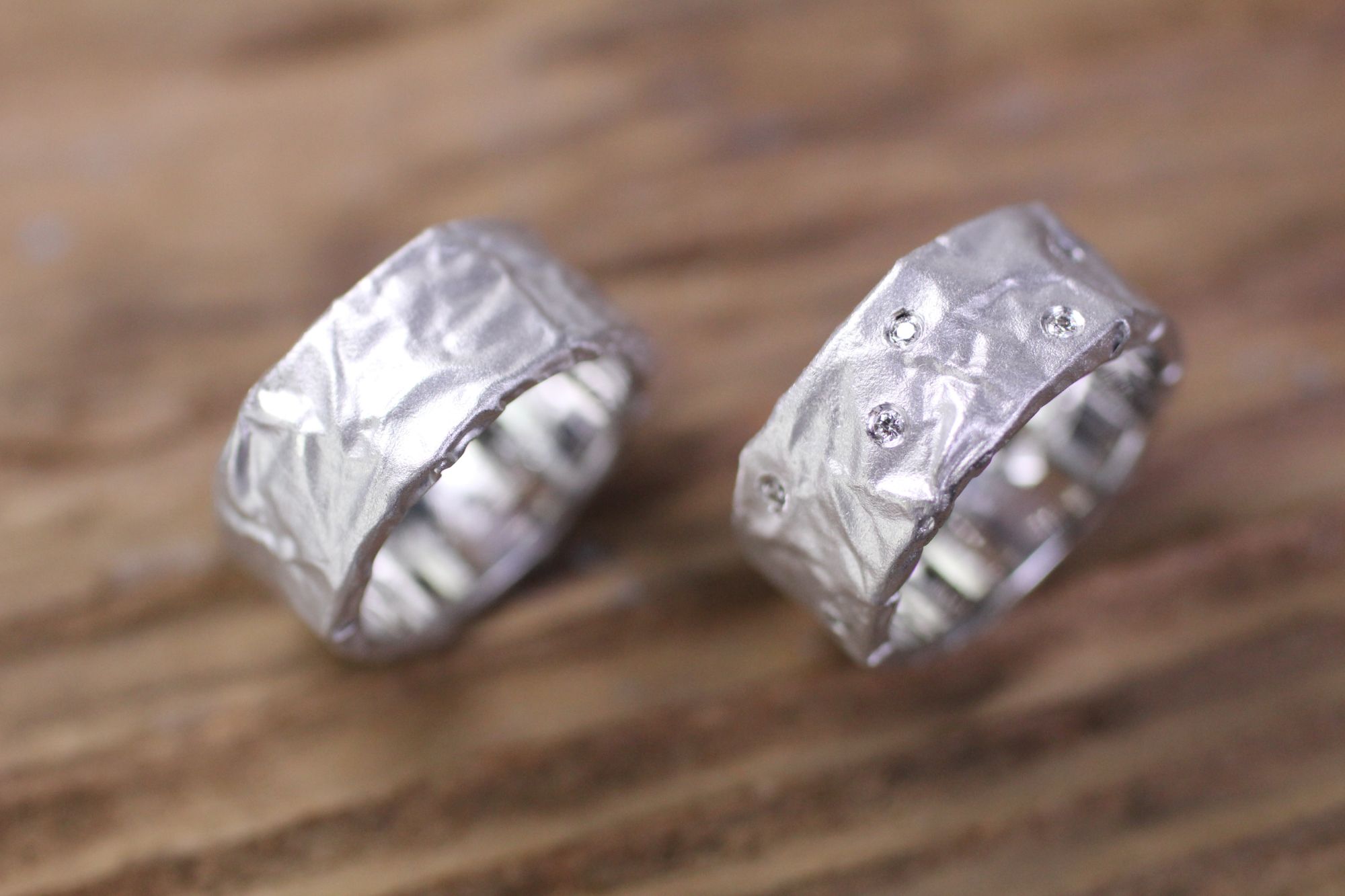 Breite Eheringe Weissgold gefaltet, verstreute Brillanten rundherum.