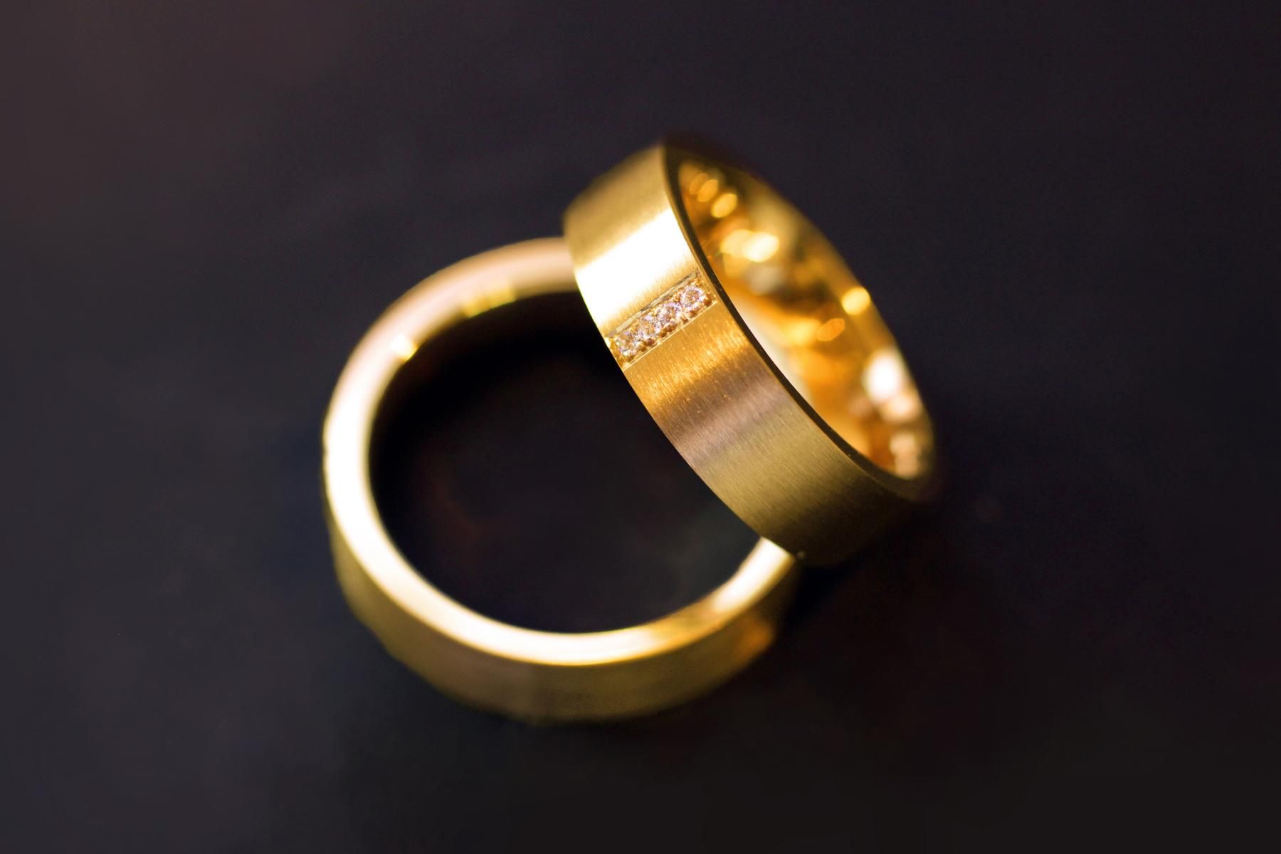 Klassische Trauringe aus Gelbgold mit flacher Oberfläche. Die Ringe sind von einer mittleren Breite und massiv gearbeitet. Die Oberfläche ist bei unserem Modell längsmattiert, die Seiten und innen sind glänzend. Der Damenring wird mit einem eleganten Brillantsegment aus vier Diamanten zusätzlich verziert. Weitere Variationen dieser Trauringe sind nach Absprache möglich. Fügen Sie die Ringe auf die Merkliste und vergleichen Sie sie mit den anderen Schmuckstücken.