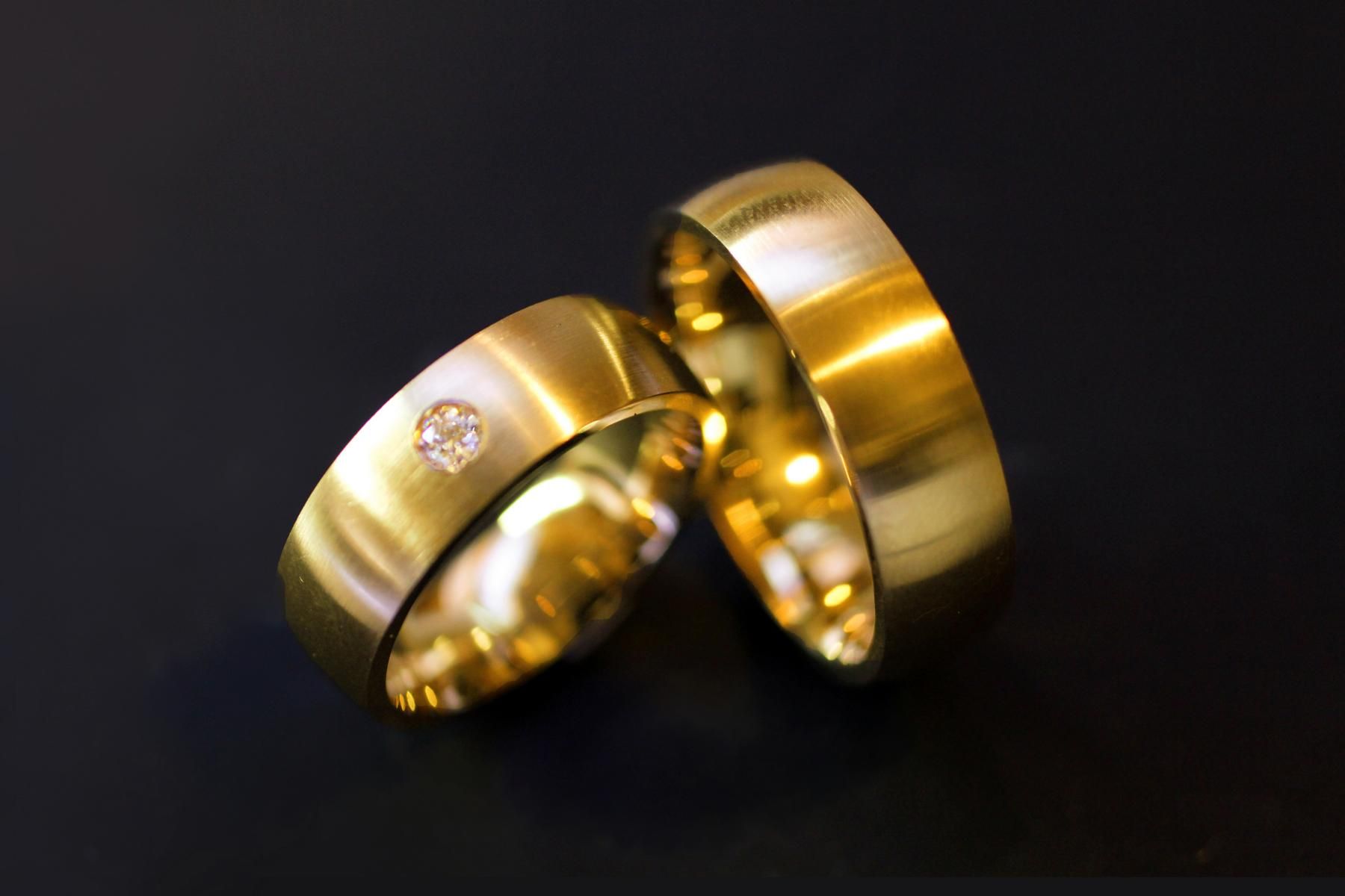Klassische Trauringe aus Gelbgold. Gewölbter Grundkörper von einer mittleren breite und hohem Tragekomfort. Innen poliert, oben längsmattiert. Der Damenring ist bei unserem Modell zusätzlich mit einem Diamanten geschmückt. Weitere Variationen dieser Trauringe sind nach Absprache möglich. Fügen Sie die Ringe auf die Merkliste und vergleichen Sie sie mit den anderen Schmuckstücken.