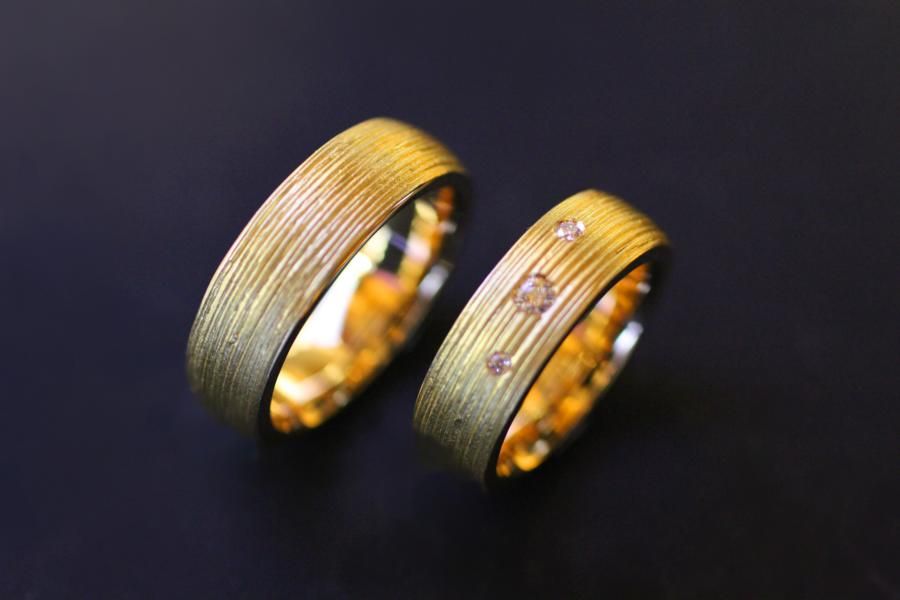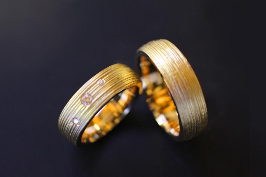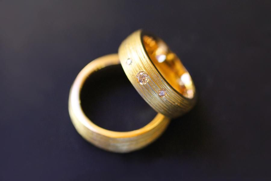 Unsere Trauringe mit dem handgemachtem Rillenmuster gehören bei uns schon fast zu den Klassikern. Sie wählen die Dicke und das Material. Eine breite Palette an Ansichtsmodellen vereinfacht ihnen die Vorstellung. Die Abgebildeten Ringe sind von einer mittleren Breite, haben eine bombierte Oberfläche und sind Massiv genug um bis ans Lebensende ein verlässlicher Partner zu sein. Der Damenring wird zusätzlich mit 3 Brillanten verziert. Weitere Variationen dieser Trauringe sind nach Absprache möglich. Fügen Sie die Ringe auf die Merkliste und vergleichen Sie sie mit den anderen Schmuckstücken.