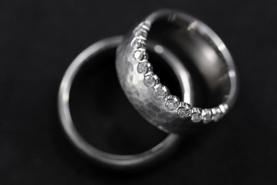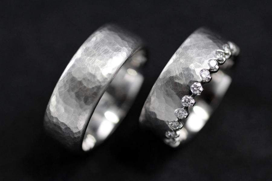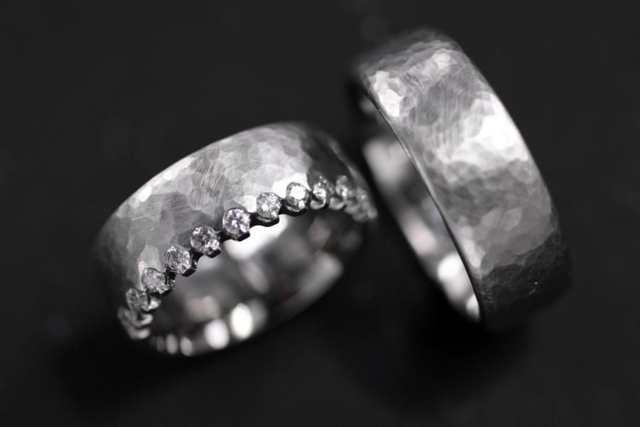 Trauringe von mittlerer Breite, starker Hammerschlag mit kratzmatter Oberfläche in Weissgold. Mit seitlichem Brillant Pavé das verspielt wie ein Krönchen gefasst ist. Die Ringe sind allseitig gerundet und versprechen einen hohen Tragekomfort. Diese besonderen Trauringe vereinen handwerklicher Look mit Klassik und Eleganz. Weitere Variationen dieser Trauringe sind nach Absprache möglich. Fügen Sie die Ringe auf die Merkliste und vergleichen Sie sie mit den anderen Schmuckstücken.