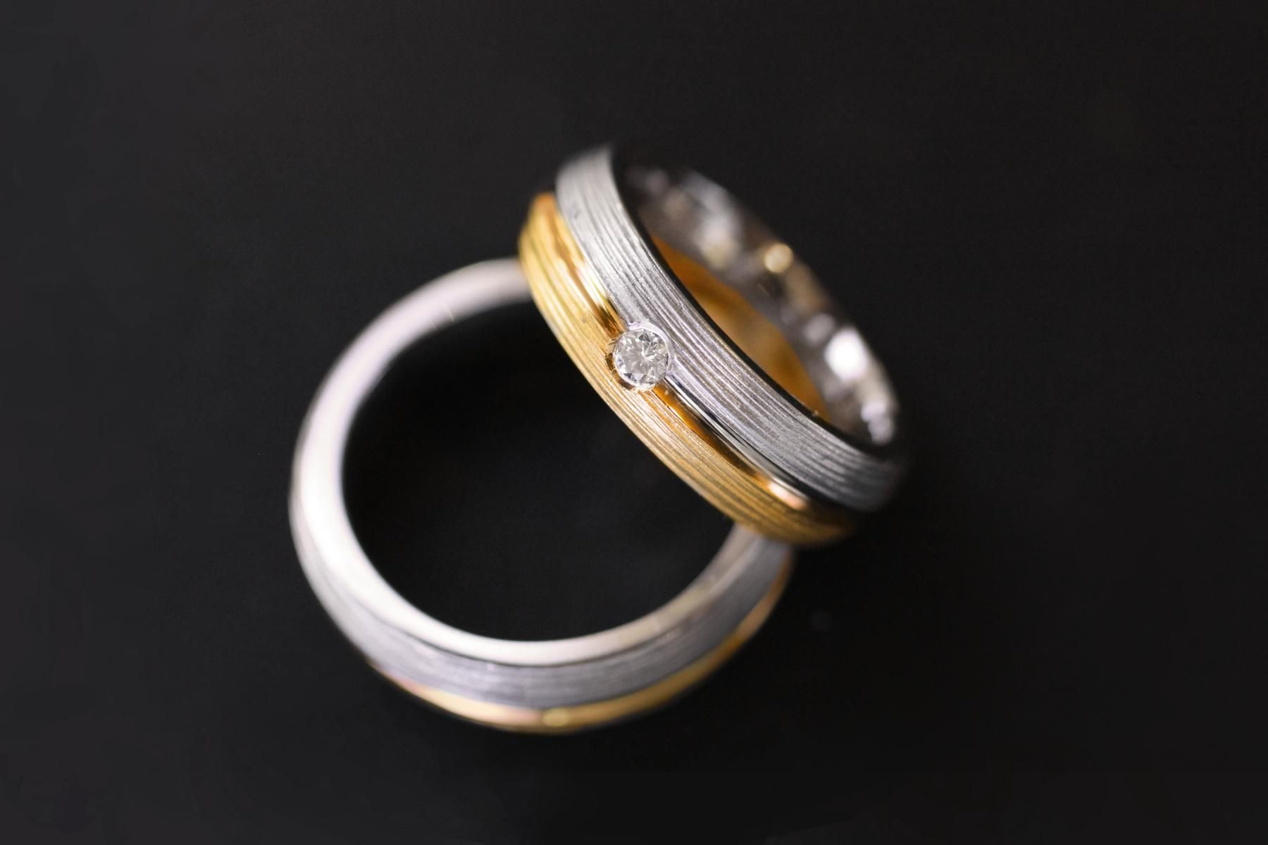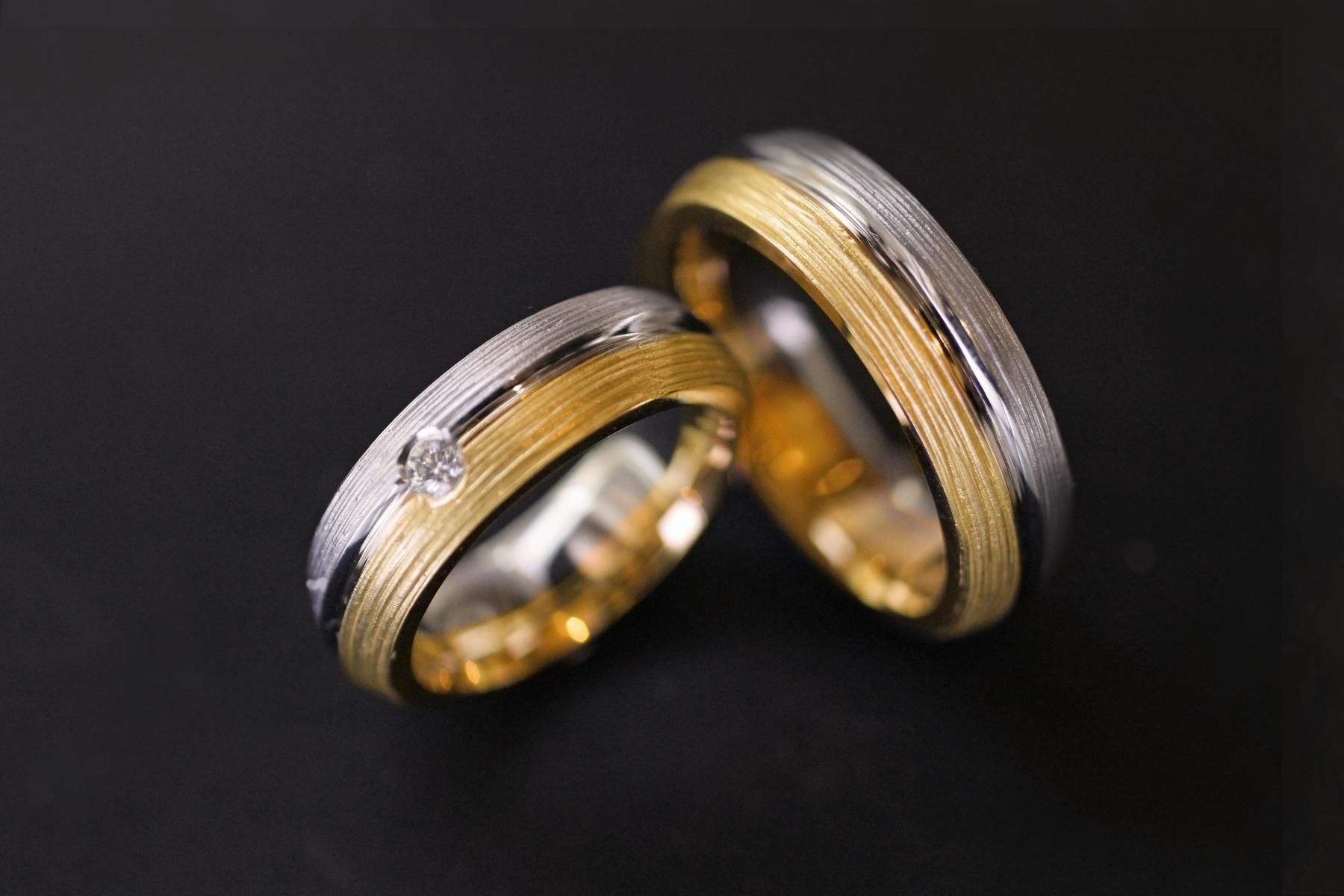 Elegante Trauringe in Gelbgold und Weissgold. Die Rillen werden bei jedem Ring von Hand gedreht. Die Seiten sind flach, die Oberfläche ist gewölbt. Das Gelbgold und Weissgold wird durch eine tiefe Rille getrennt. Diese Trauringe sind in einer mittlere Breite, massiv und von einer Zeitlosen Schönheit. Der Damentrauring wird bei unserem Beispiel zusätzlich mit einem Diamanten verziert. Weitere Variationen dieser Trauringe sind nach Absprache möglich. Fügen Sie die Ringe auf die Merkliste und vergleichen Sie sie mit den anderen Schmuckstücken.